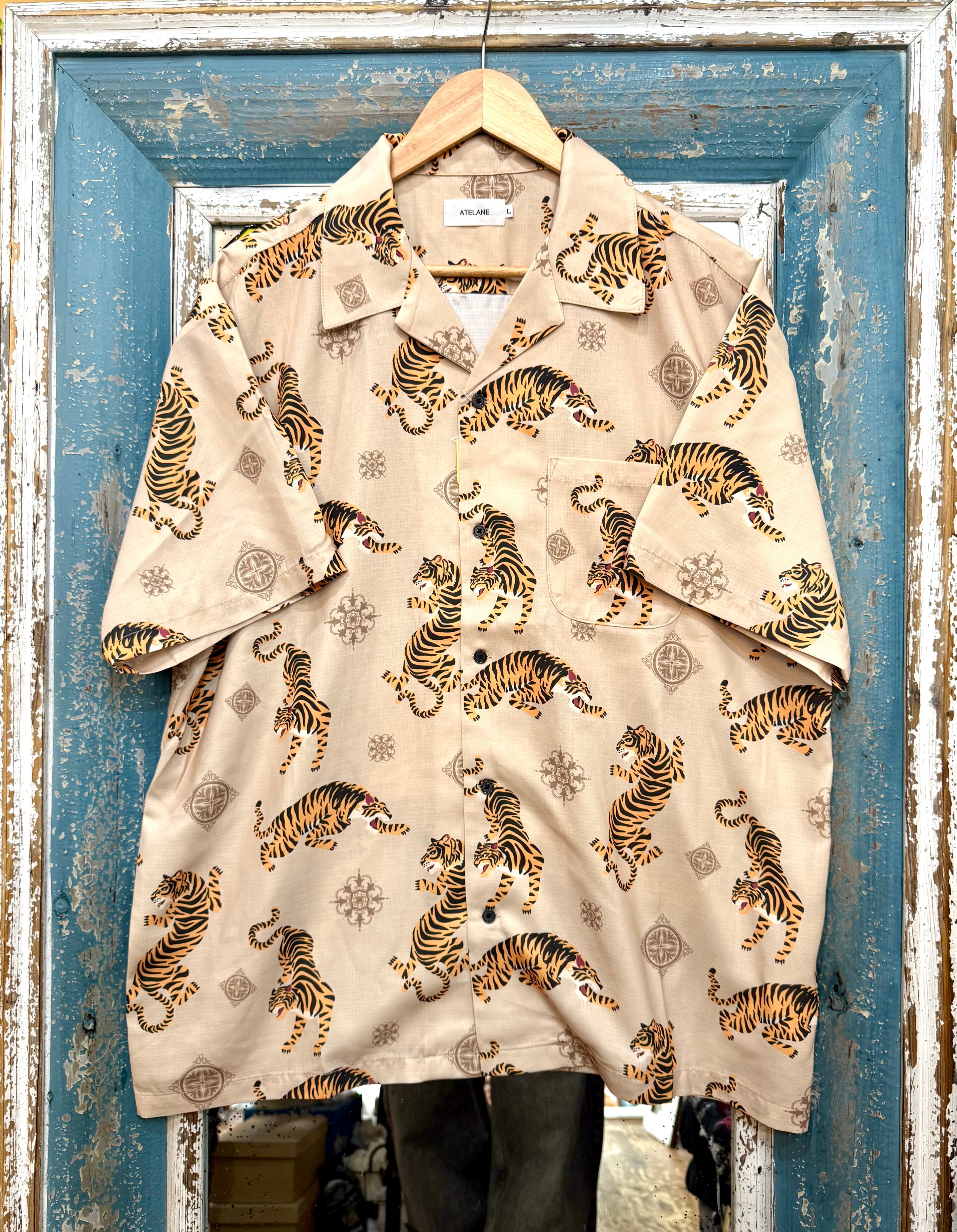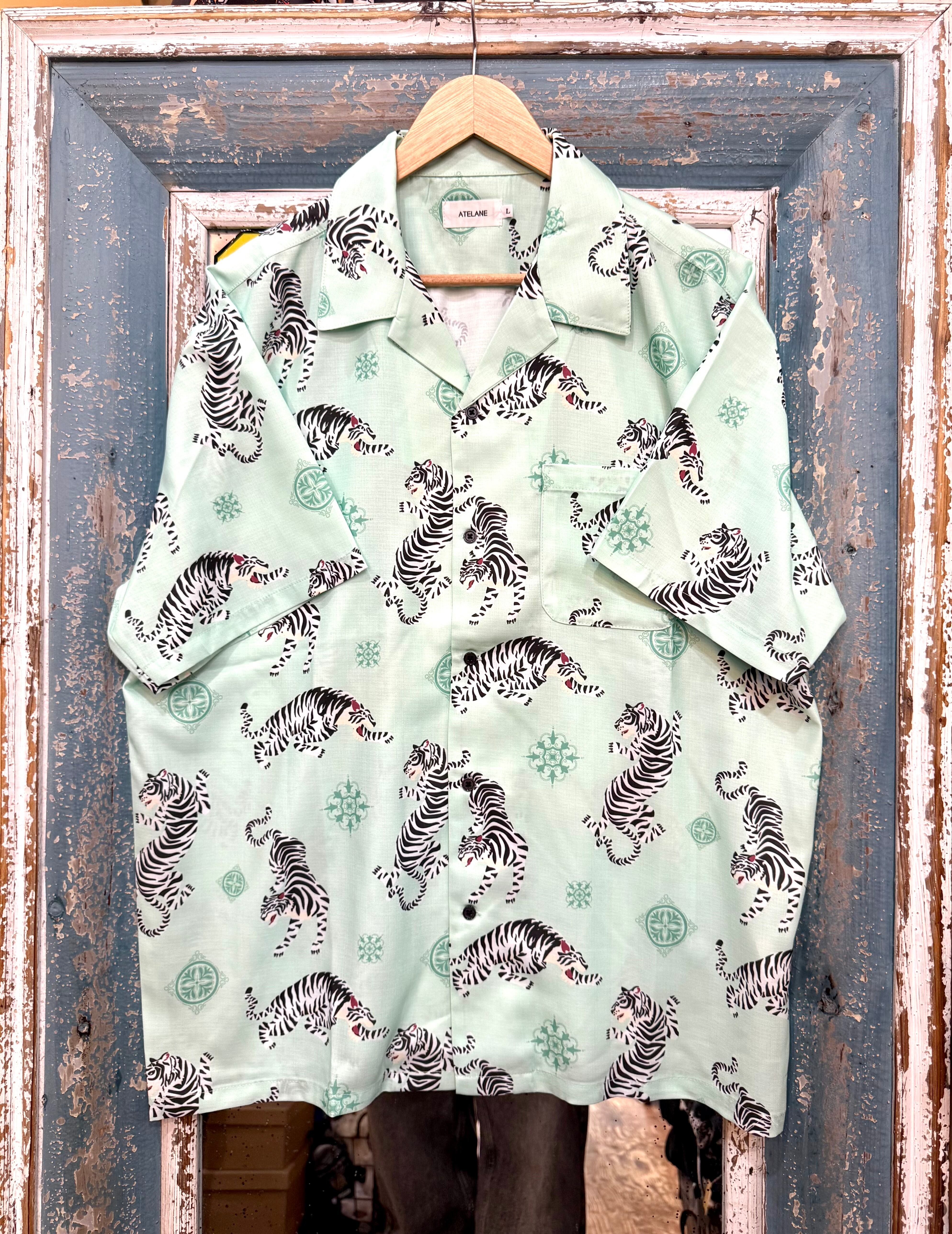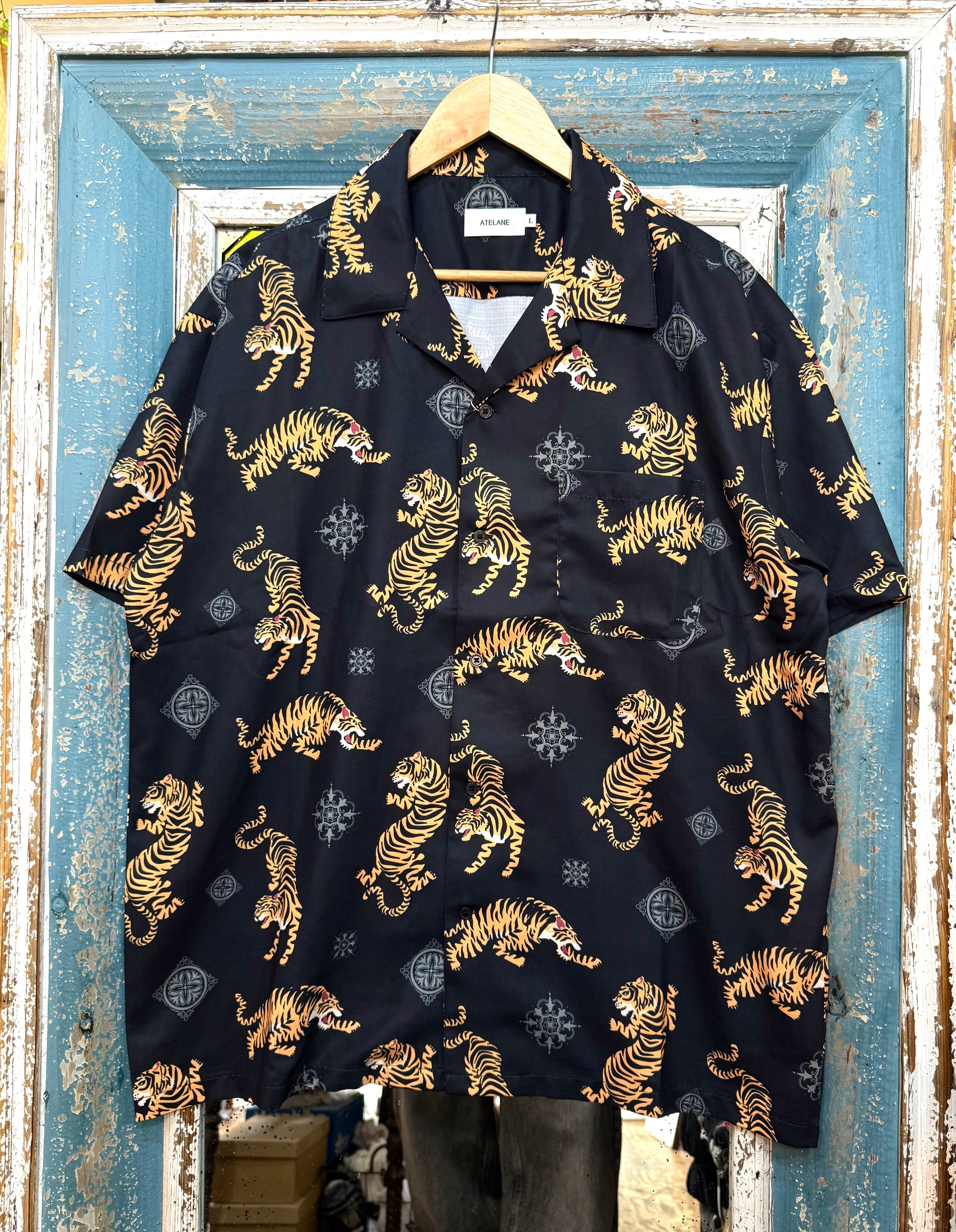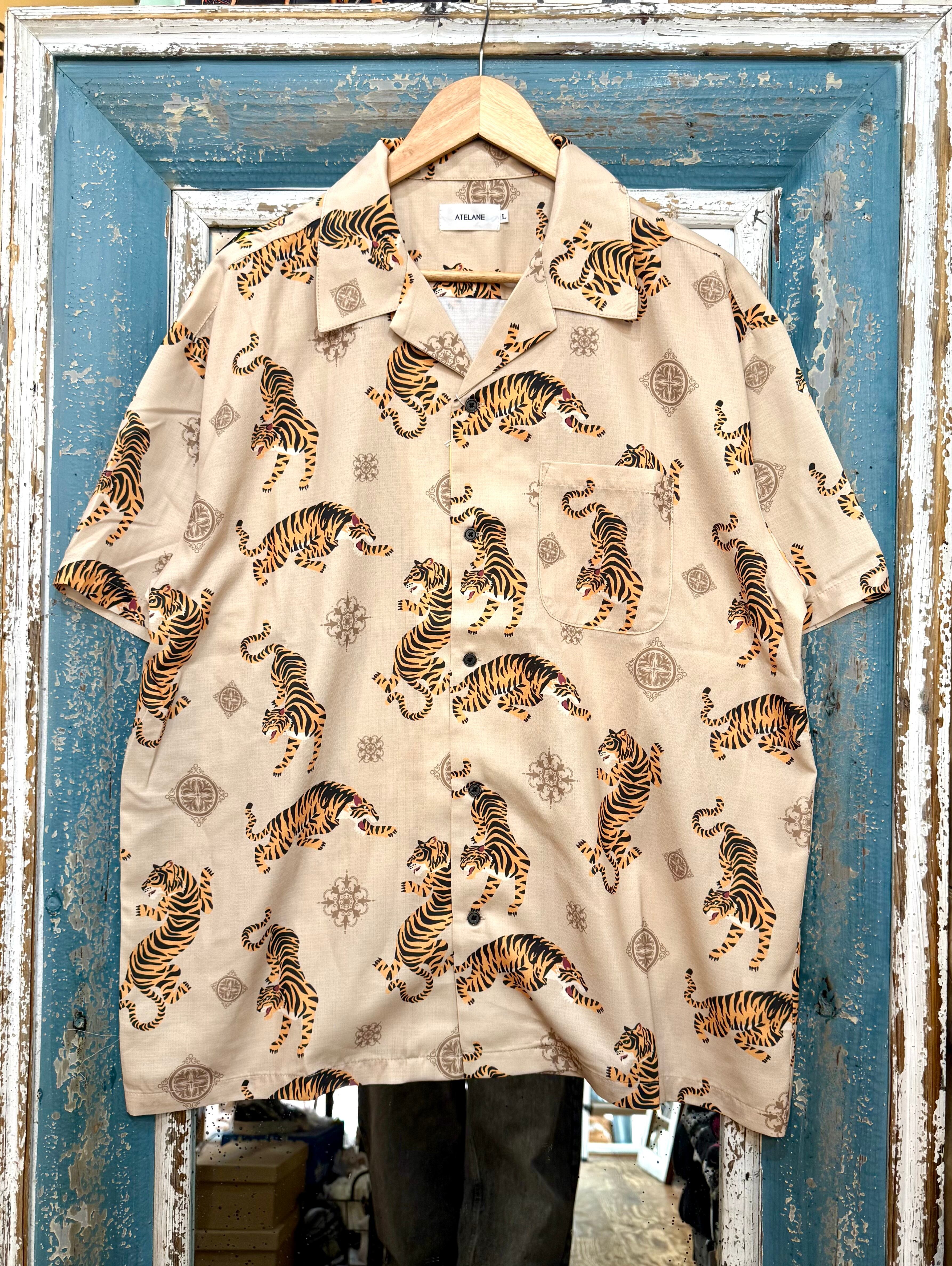 ATELANE/アテレーン定番のルーズシルエット総柄開襟アロハシャツ。オリジナルのトラ柄インパクト抜群の一枚。