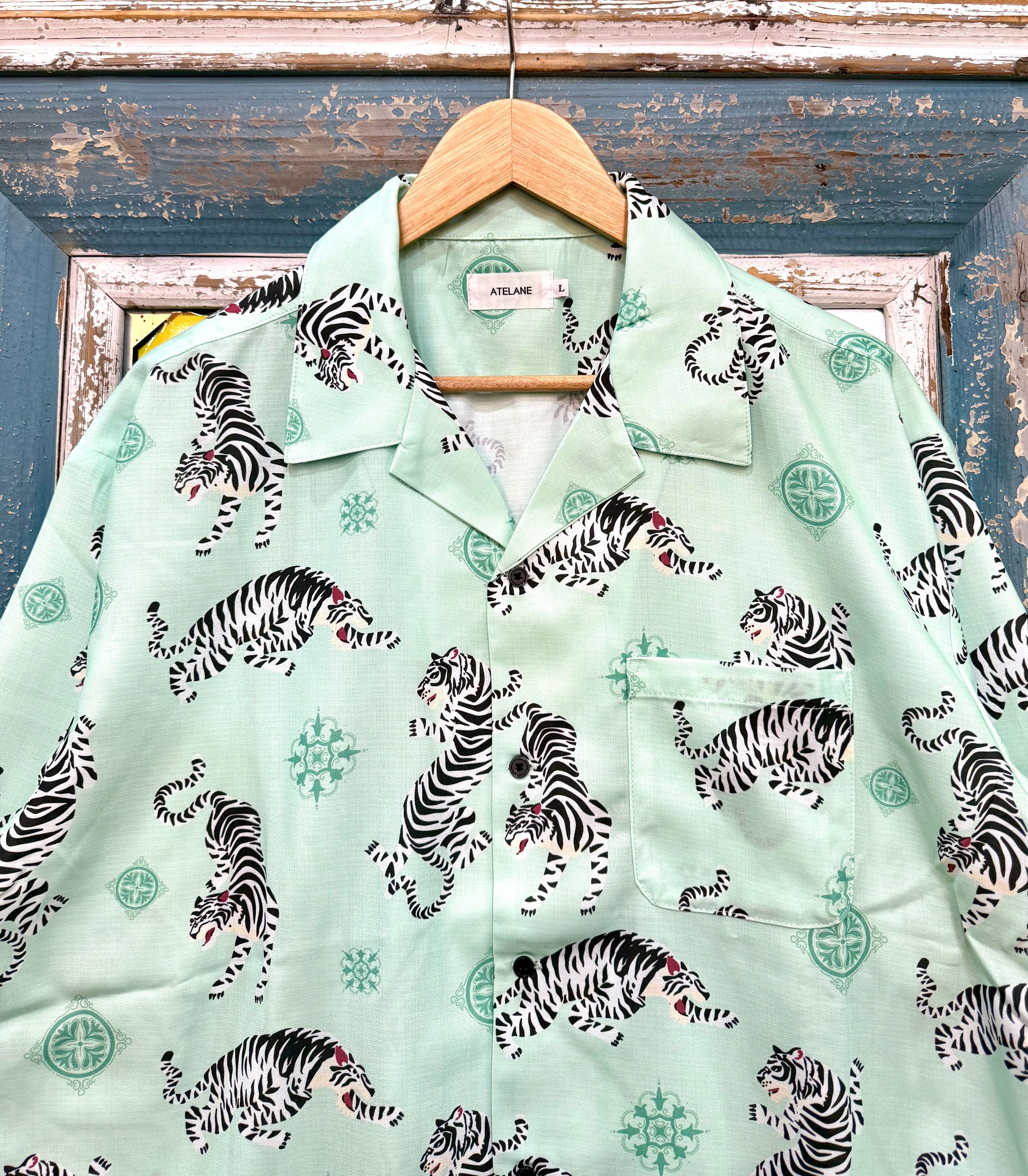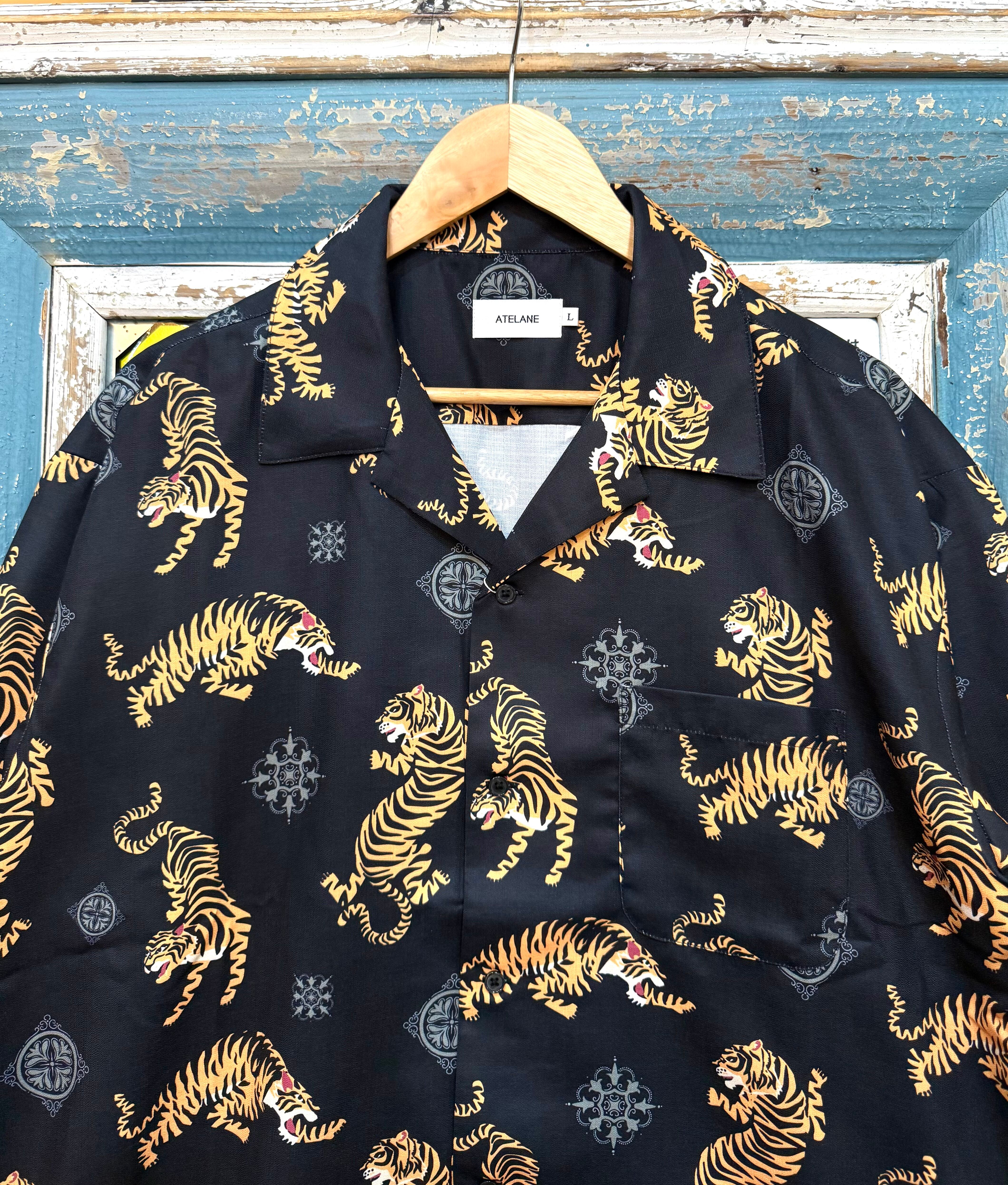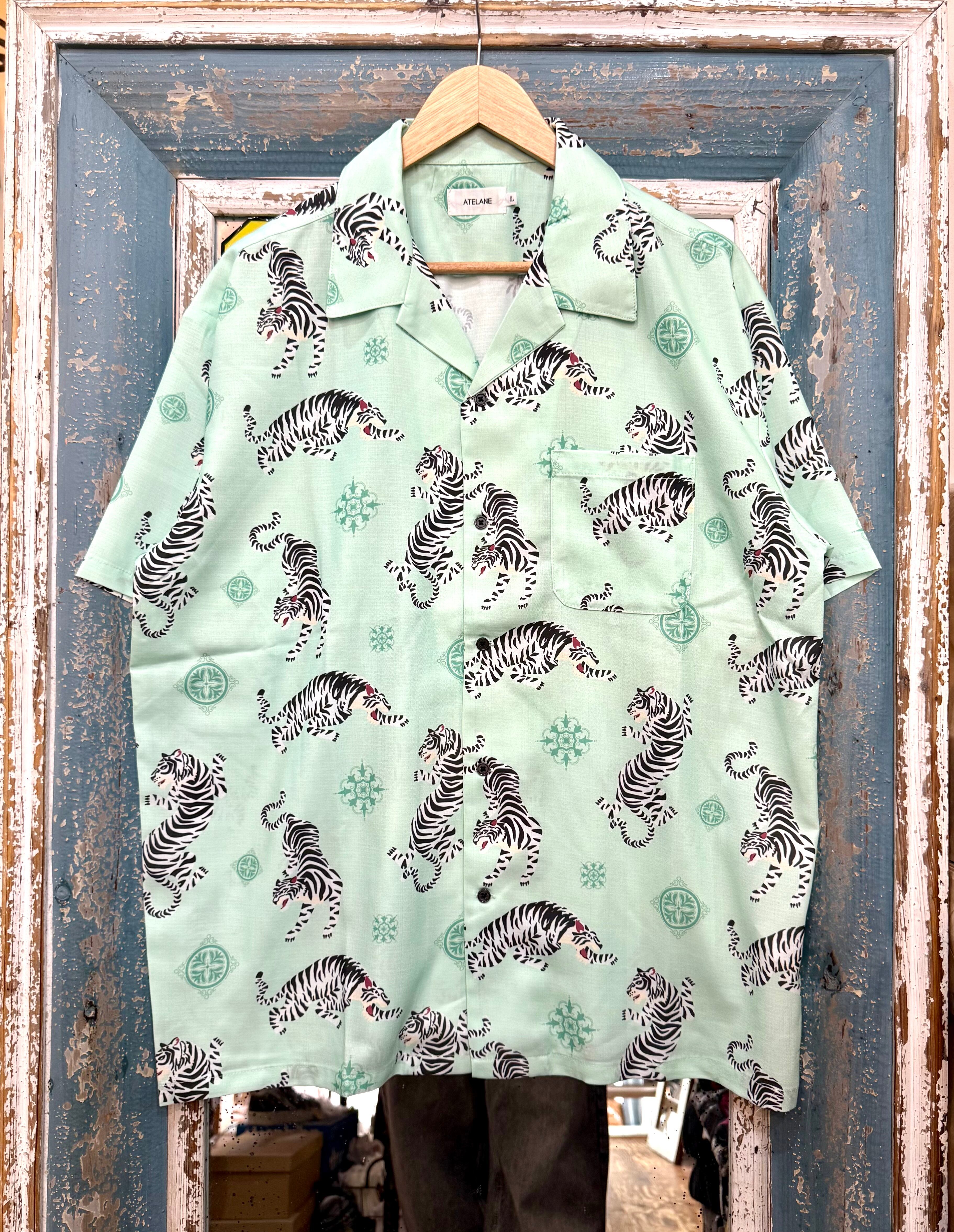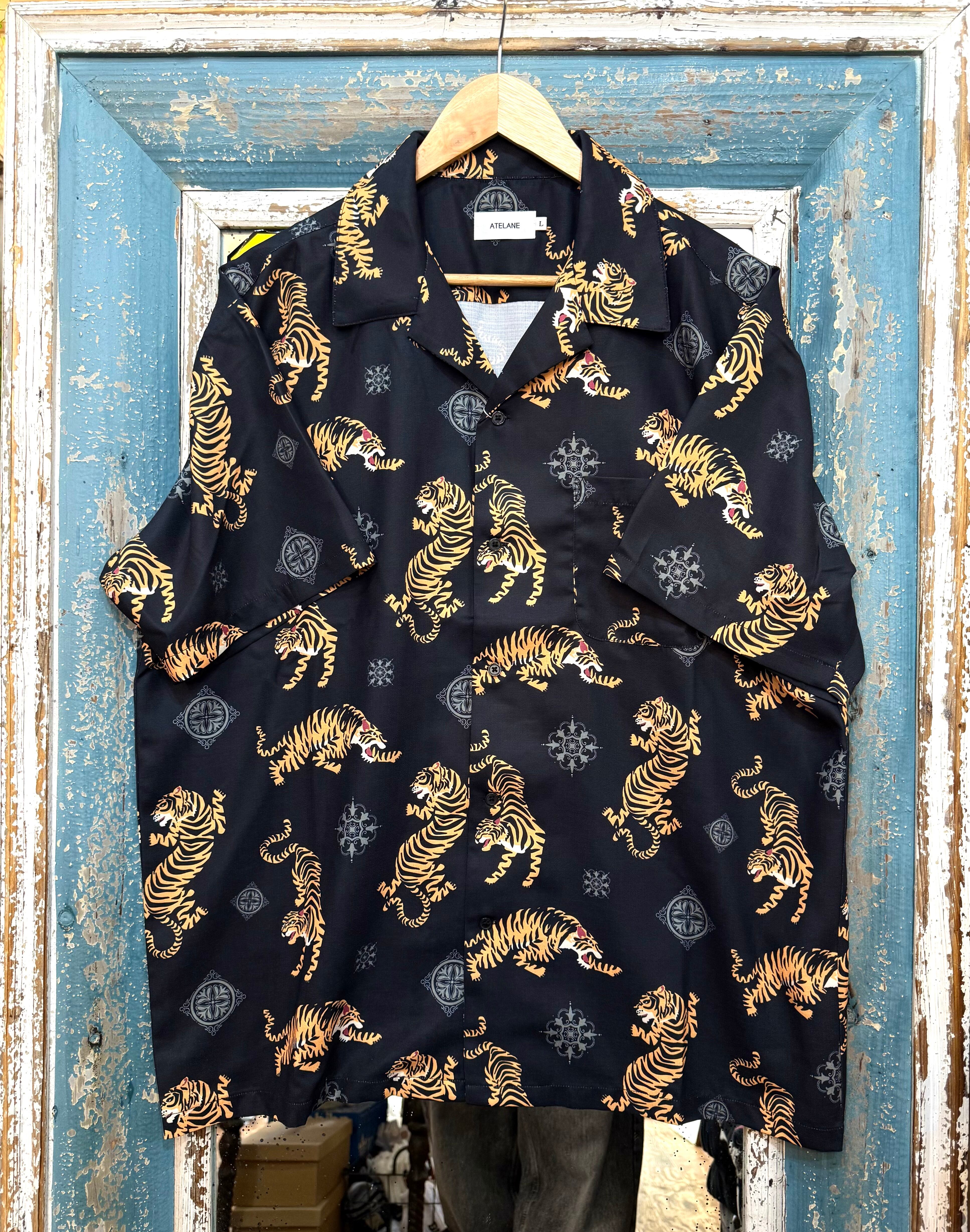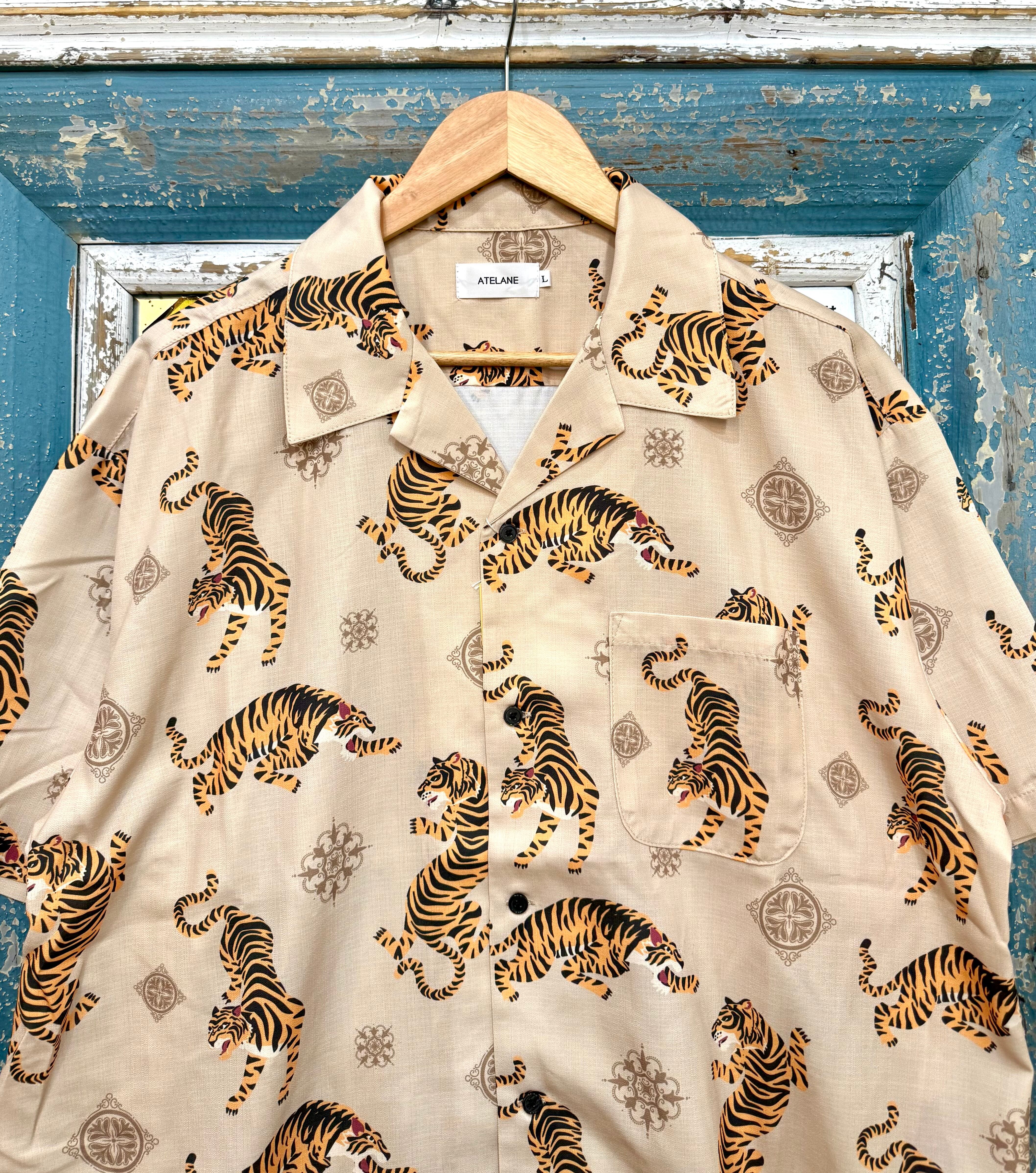 ATELANE/アテレーン定番のルーズシルエット総柄開襟アロハシャツ。オリジナルのトラ柄インパクト抜群の一枚。