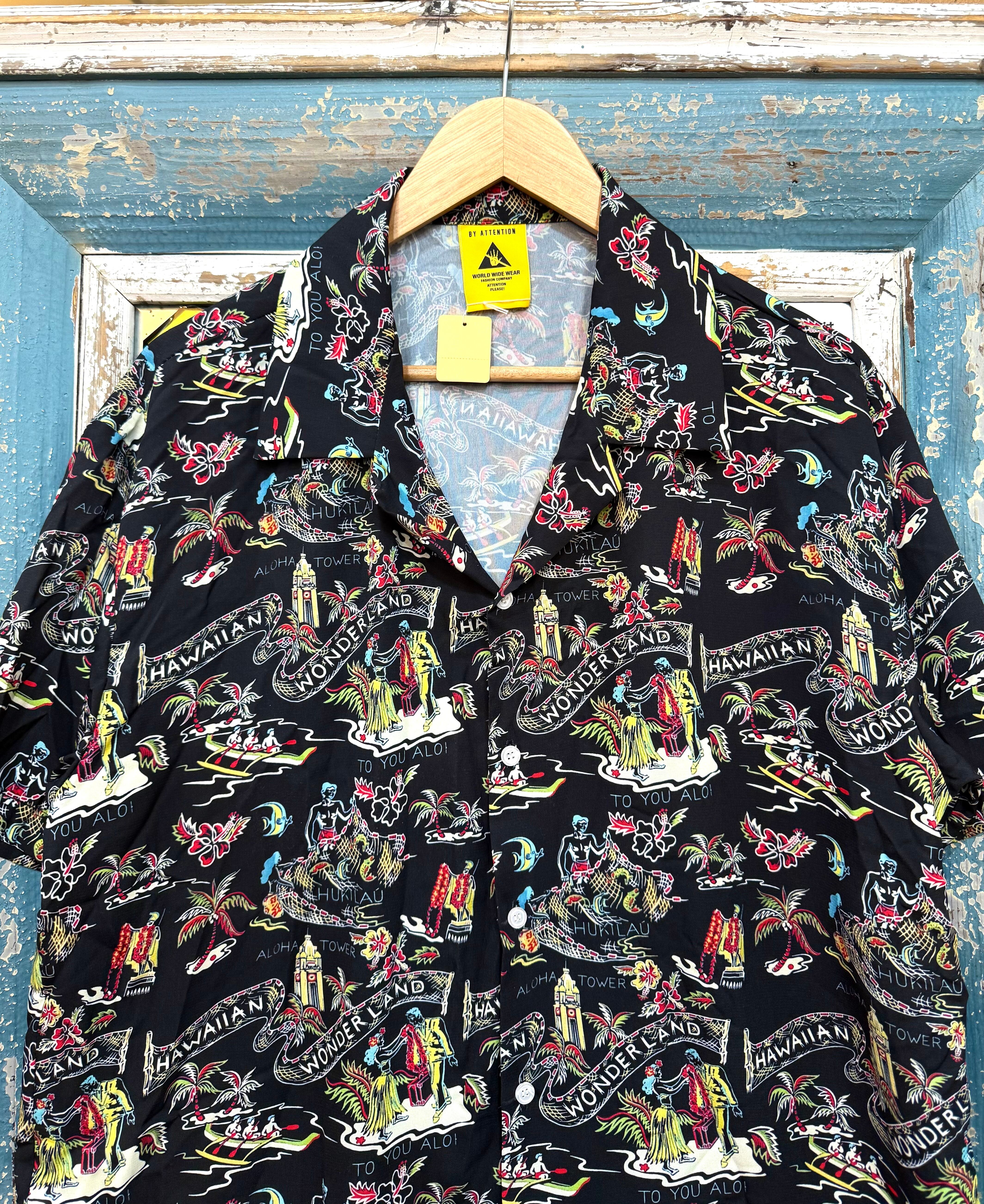 ハワイの雰囲気を存分に楽しめる、ハワイアンな総柄プリントのオープンカラー半袖シャツ。ピンクとブラックの2色をご用意しました。