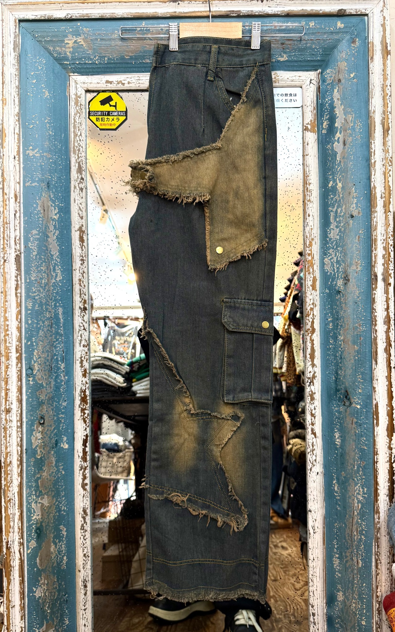 左右で星型になる切替が特徴的なデザイン 切替デニム!ユニークなスタイルで、カジュアルな日常使いから特別な日のおしゃれまで幅広く活躍します。