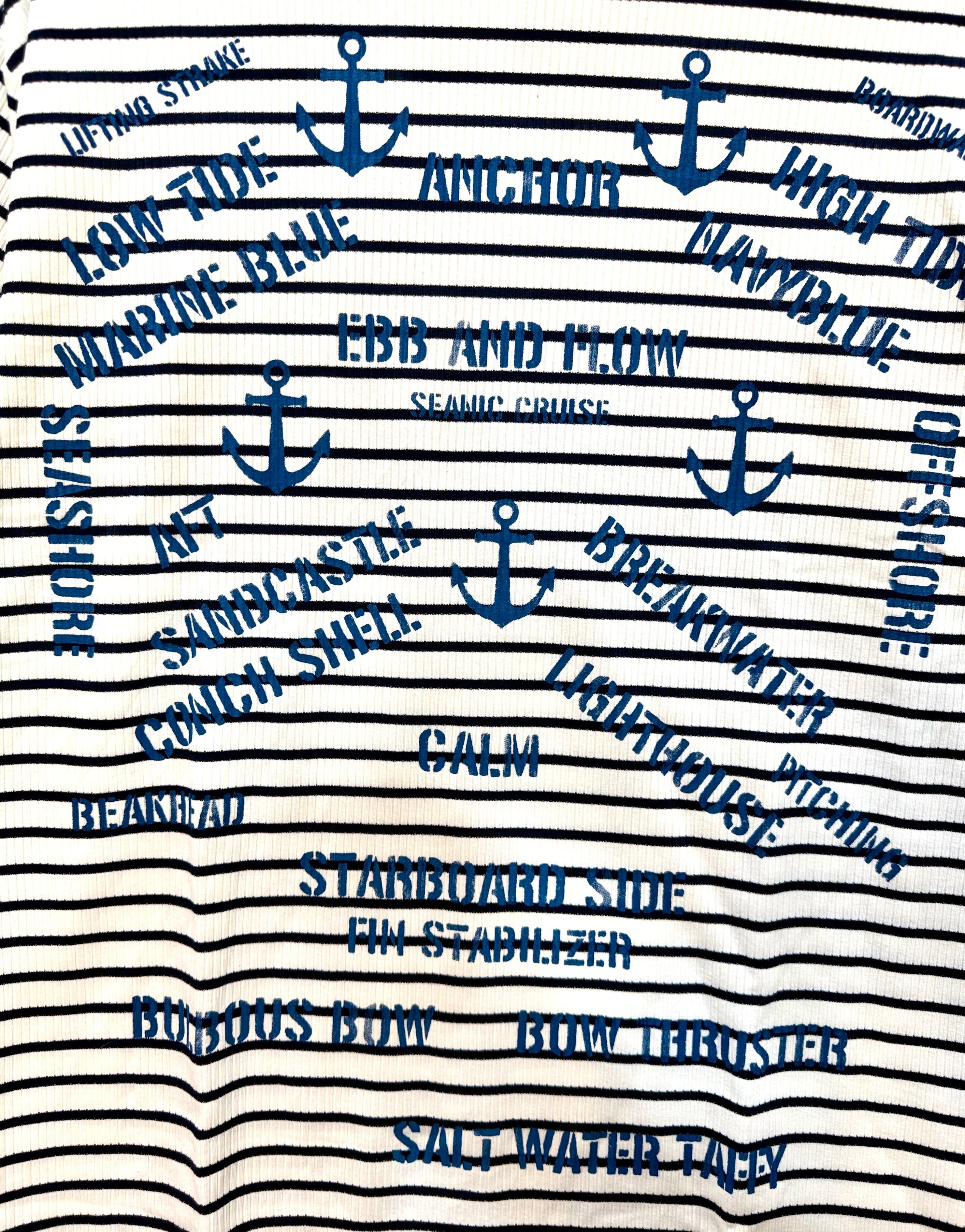 前身ごろに大胆にオリジナルのマリンプリントを施したインパクトのあるデザイン。