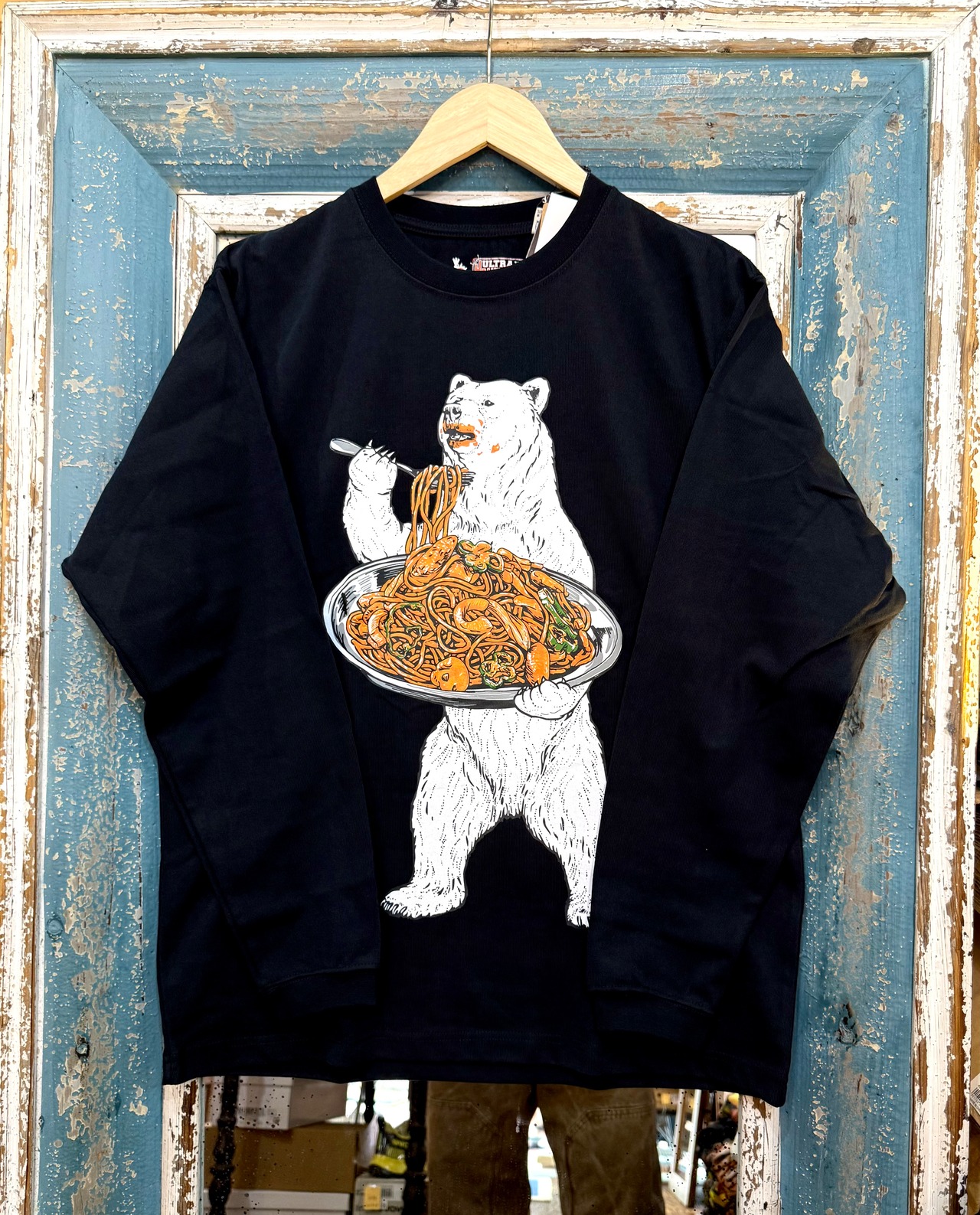 go slow caravan昔懐かし昭和喫茶のナポリタンを頬張るわんぱくなクマ。ヘビーなベーシックシルエットのロングスリーブT。バックサイドには生地オリジナルネームが縫い付けられる。