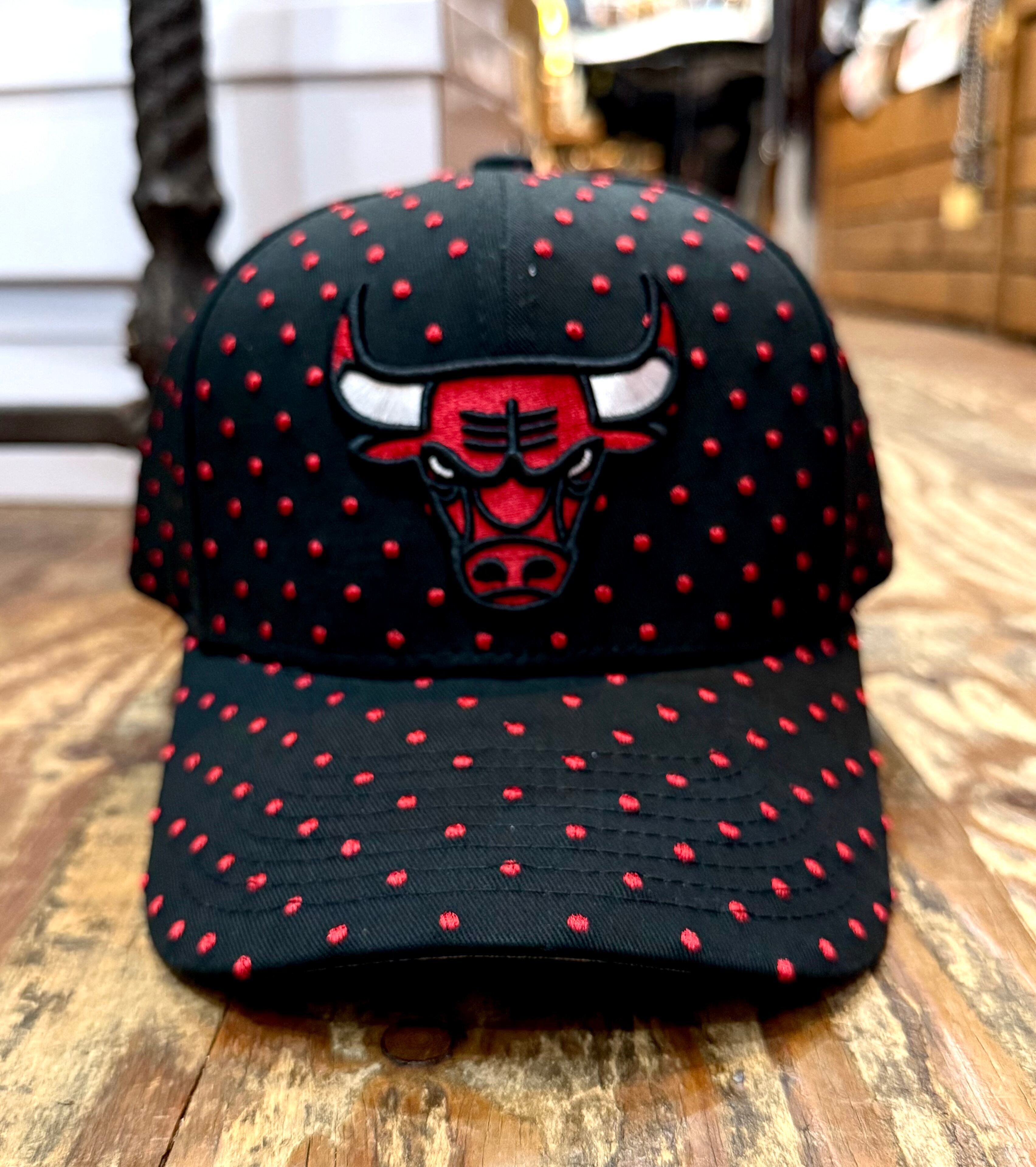 アメリカより買い付けたミッチェル&ネスのキャップです。ドット柄が特徴で、コーディネートのアクセントにぴったりです!ブルズのロゴがデザインに華やかさを添え、カジュアルからストリートスタイルまで幅広く活躍します。