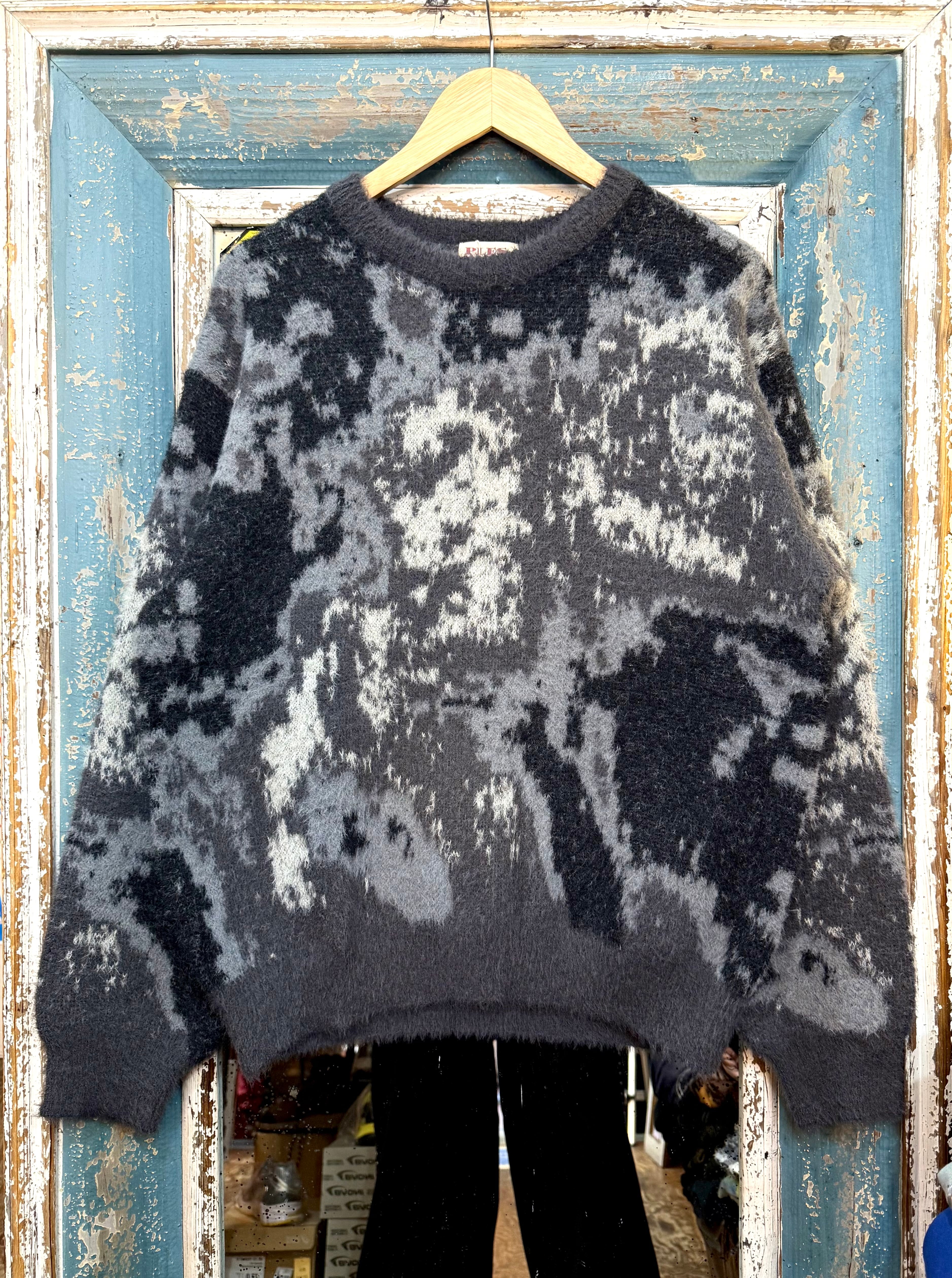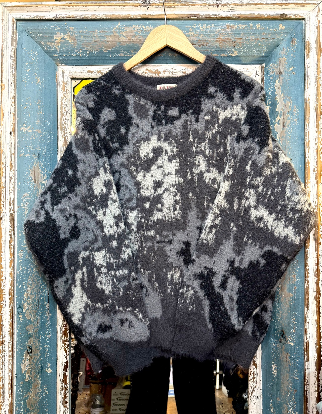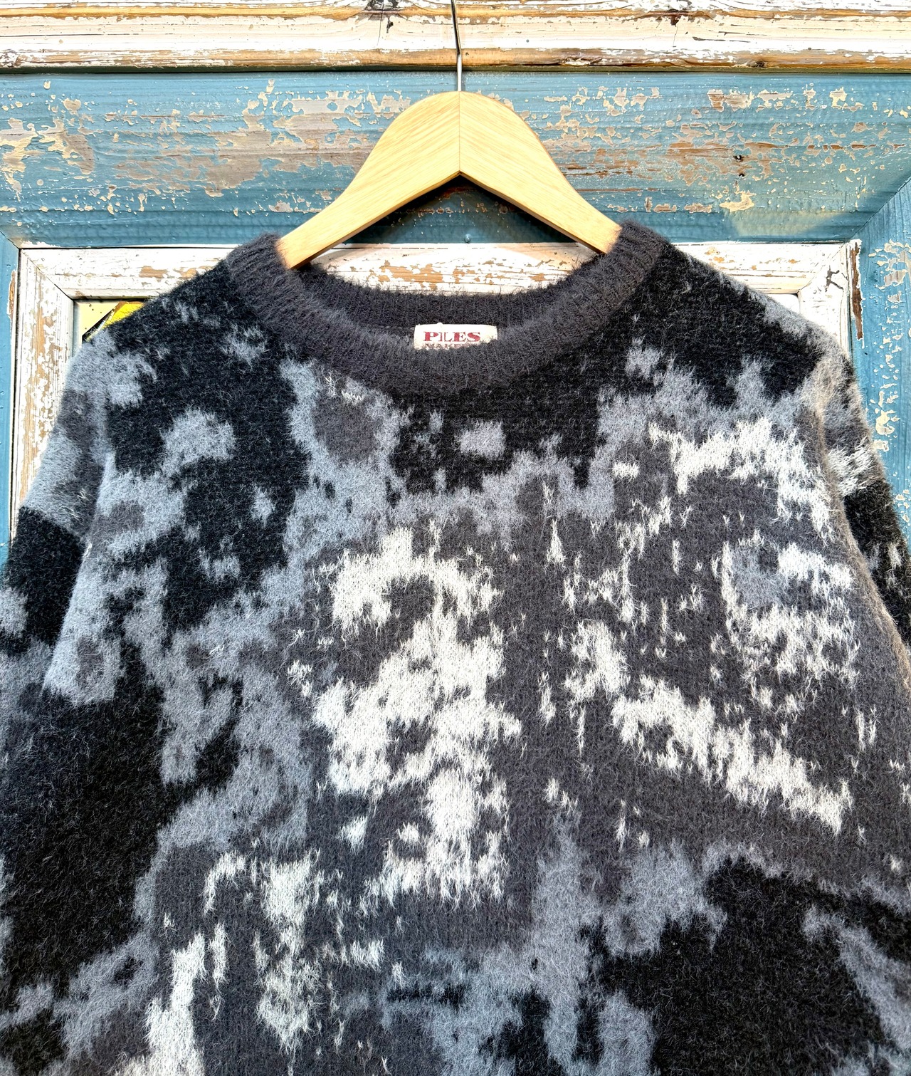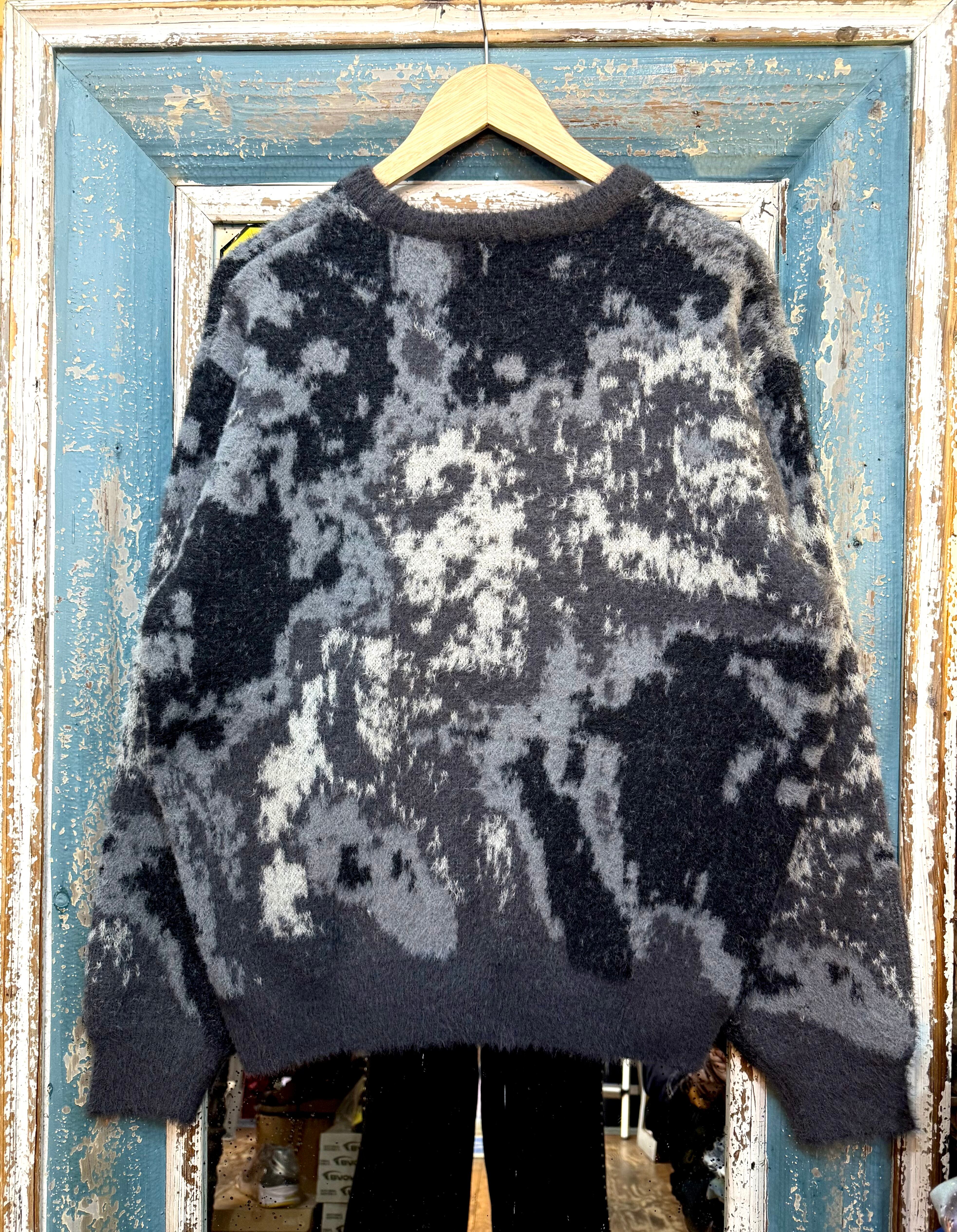 主役はこの一枚。アートな抽象柄シャギーニット ・アニマル柄のようにも、抽象画のようにも見える独創的なパターン。ダブルジャガードで緻密に表現された柄は、凡百のプリントニットとは一線を画す高級感を放ちます。「そのニット、どこの?」と必ず聞かれる、ワードローブの主役です。・このニット自体に強い個性があるため、ボトムスはシンプルなスラックスやデニムを合わせるだけでスタイルが完成します。接客時間を短縮しつつ、説得力のあるコーディネート提案が可能になり、結果として客単価アップに繋がります。・やや肩を落としたドロップショルダーと、程よいボリューム感のある袖。トレンド感がありながら、だらしなく見えない絶妙なバランスは、一枚で着るだけでスタイリングを完成させます。