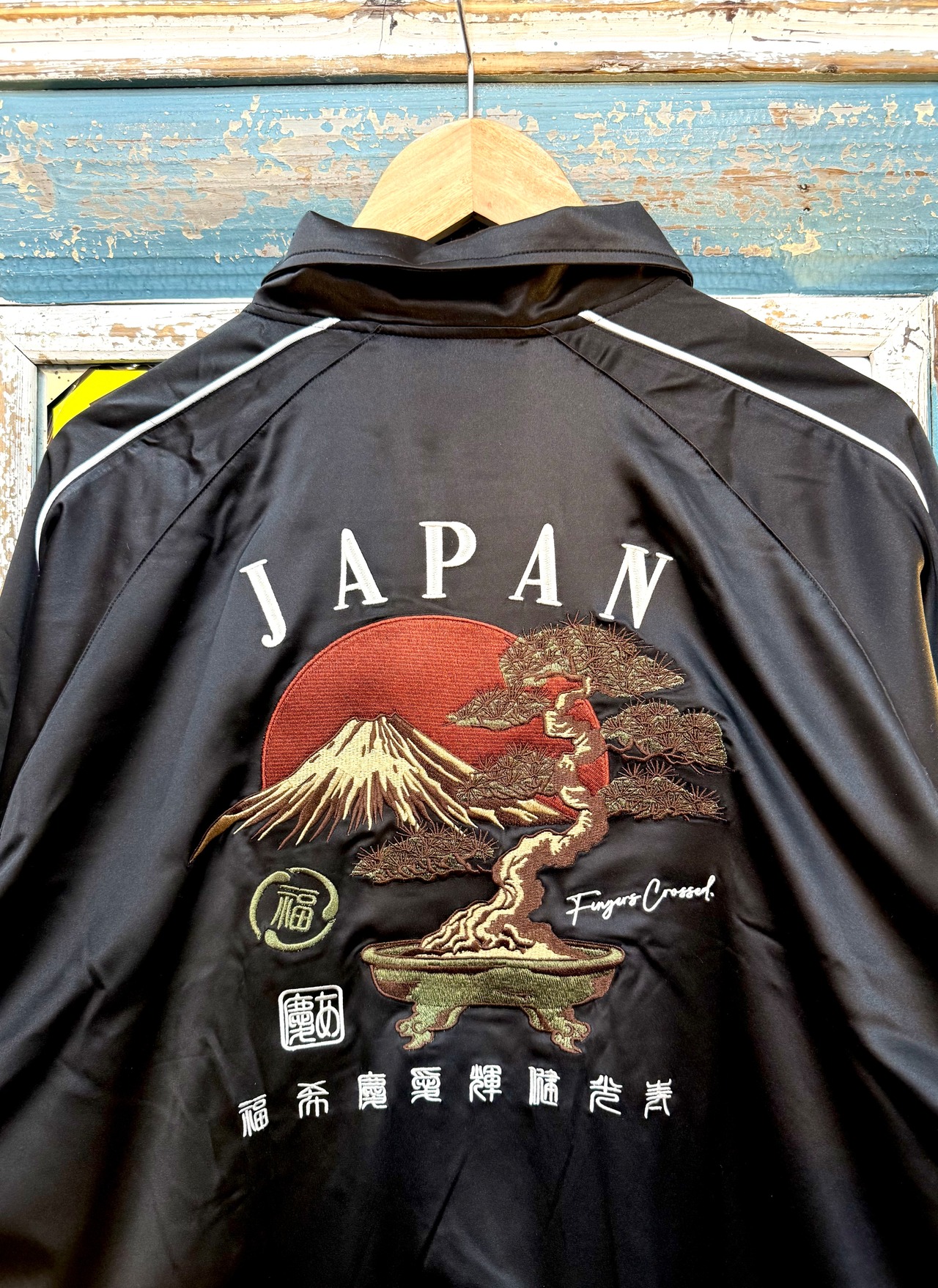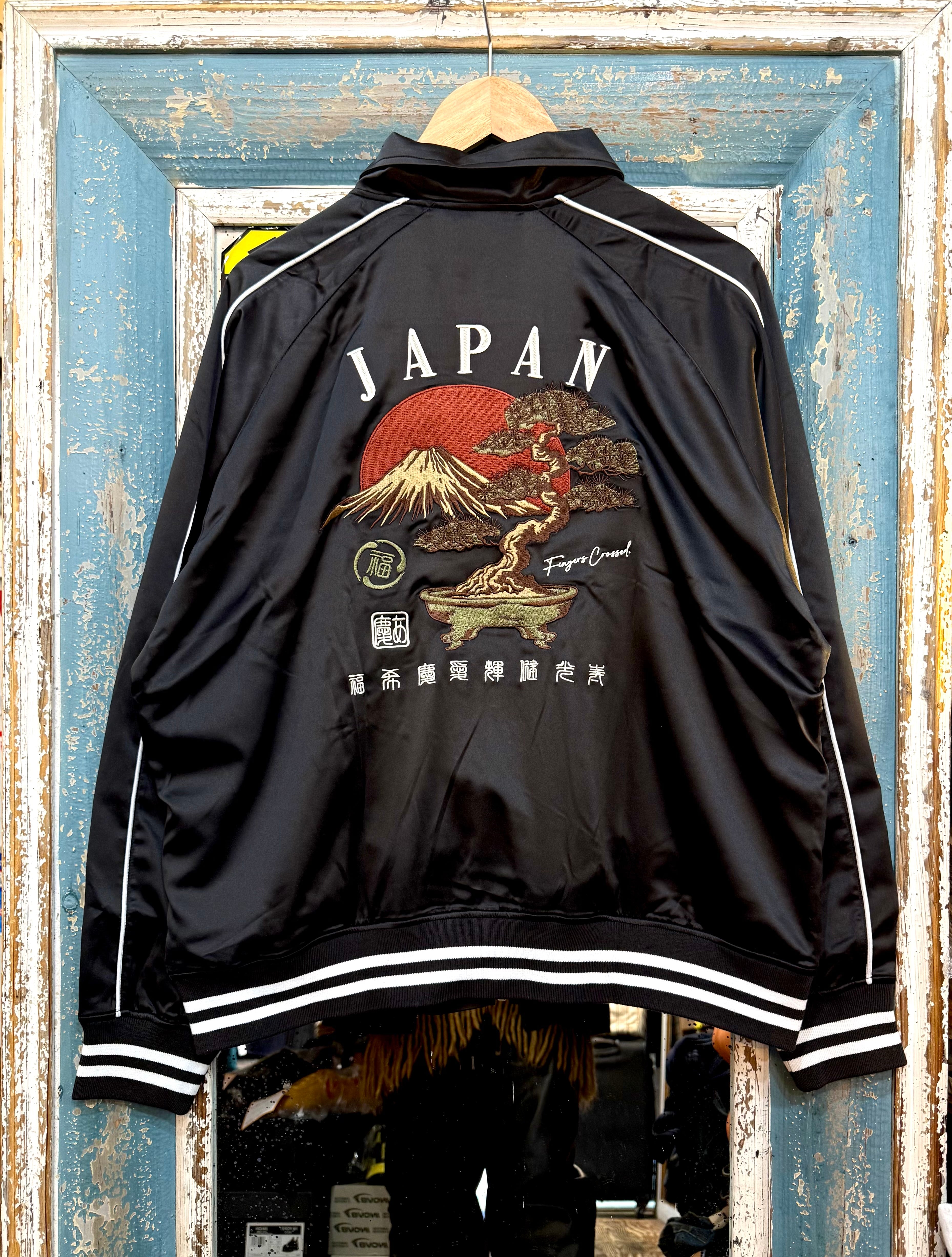 ● バックに富士山、盆栽をダイナミックに刺繍● フロントは漢字をブロック型に配置● 袖や裏地に配色を効かせ、サテンの光沢感が映えるデザイン● お土産にもおすすめの1枚● ユニセックスで着用可能