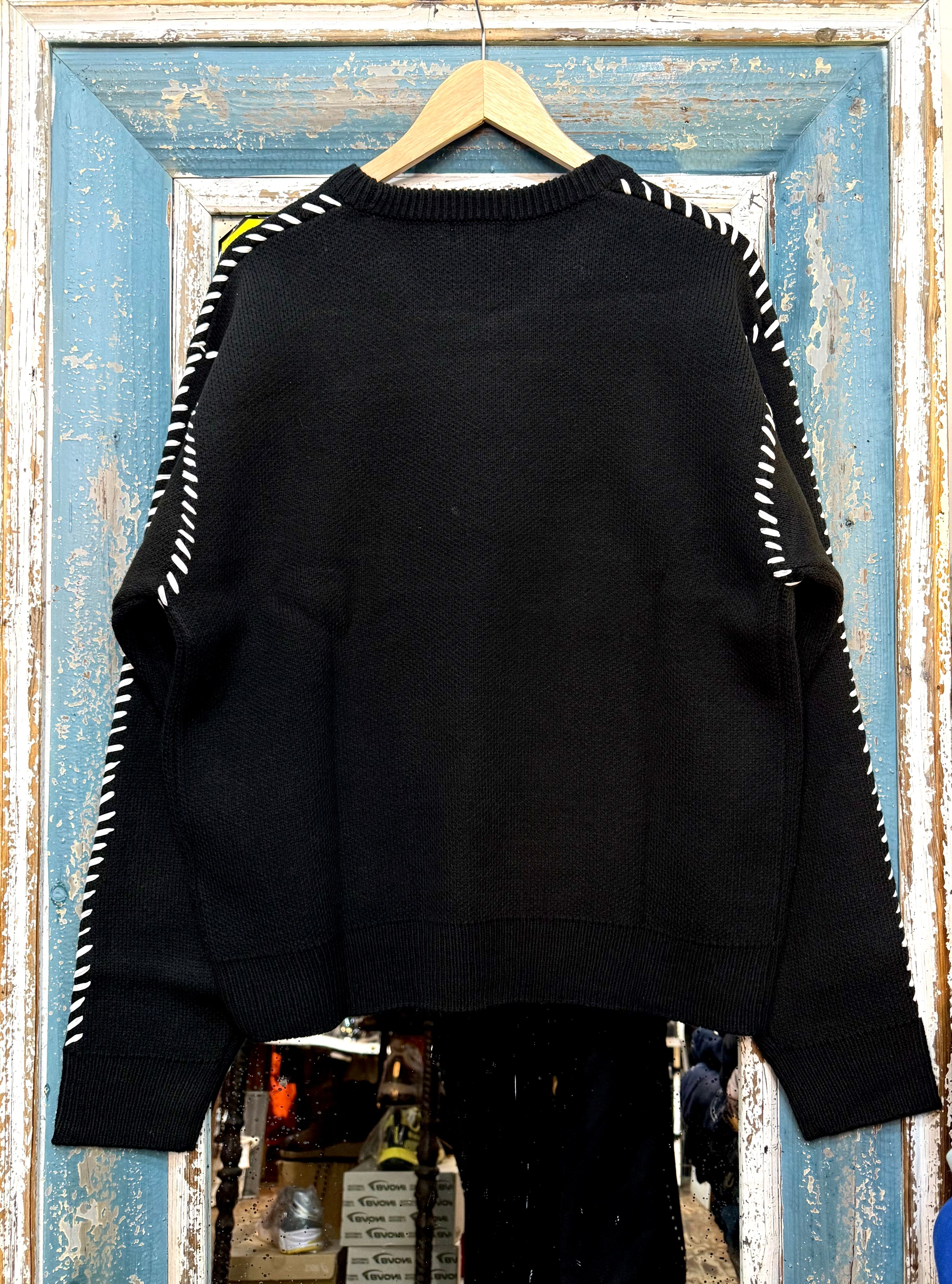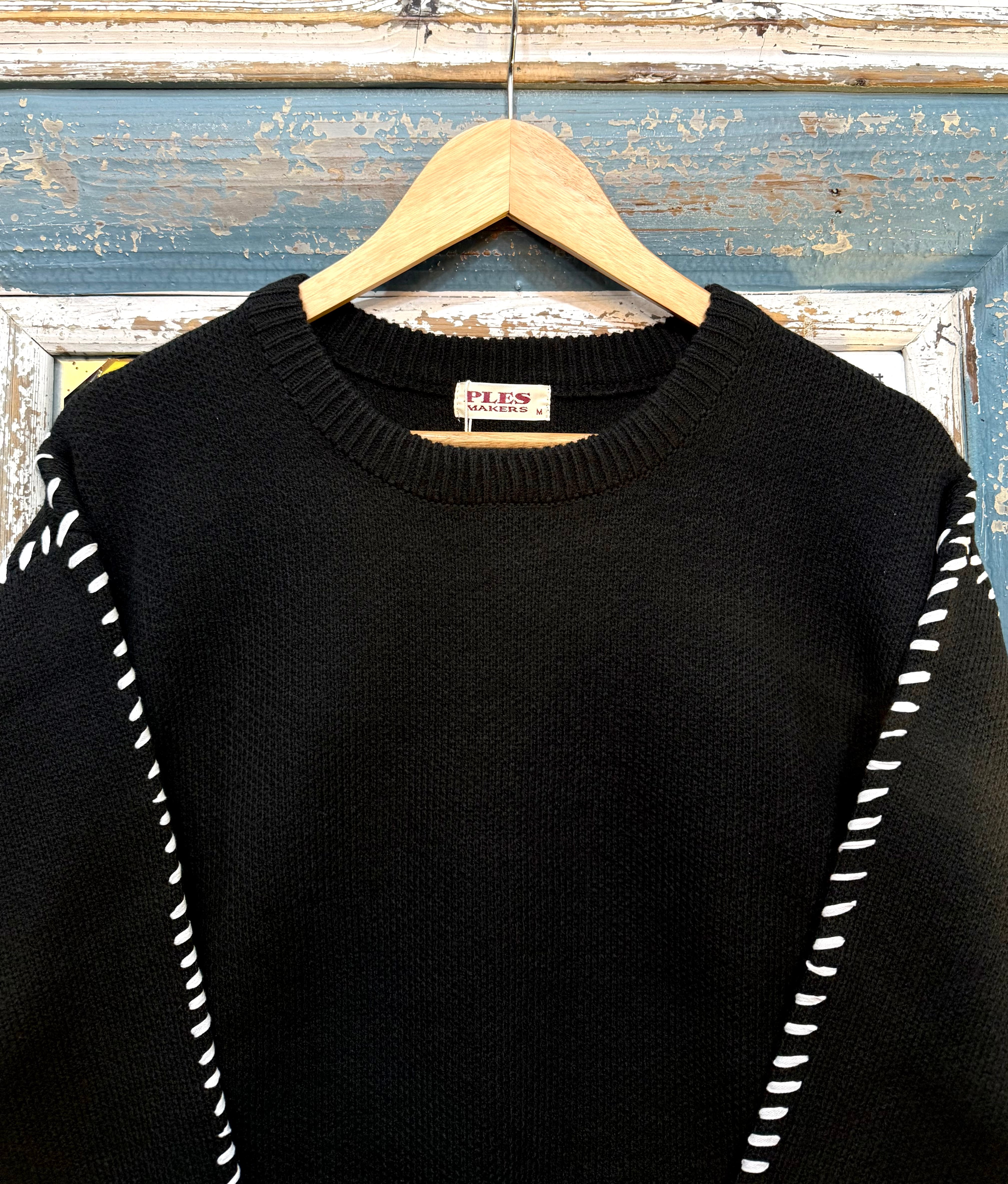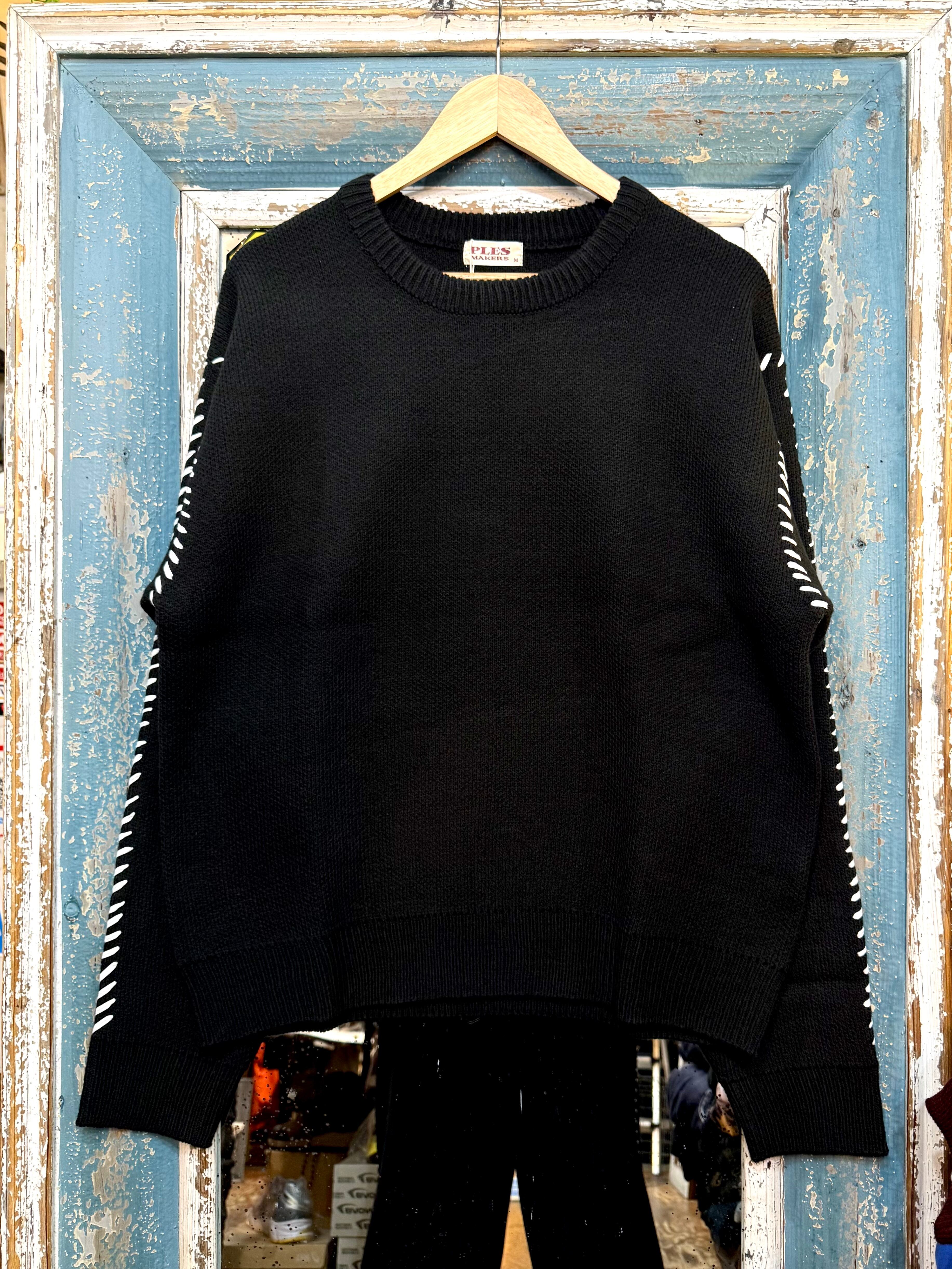 白糸のハンドステッチがアクセントとなり、シンプルでありながらも個性的な魅力を放つクルーネックニットです。絶妙なサイズ感は、今のファッションにぴったりフィットし、どんなスタイルにも合わせやすいので、ワードローブの定番アイテムとしてお楽しみいただけます。これ一枚でコーディネートが決まり、季節を問わず重宝すること間違いなしです!