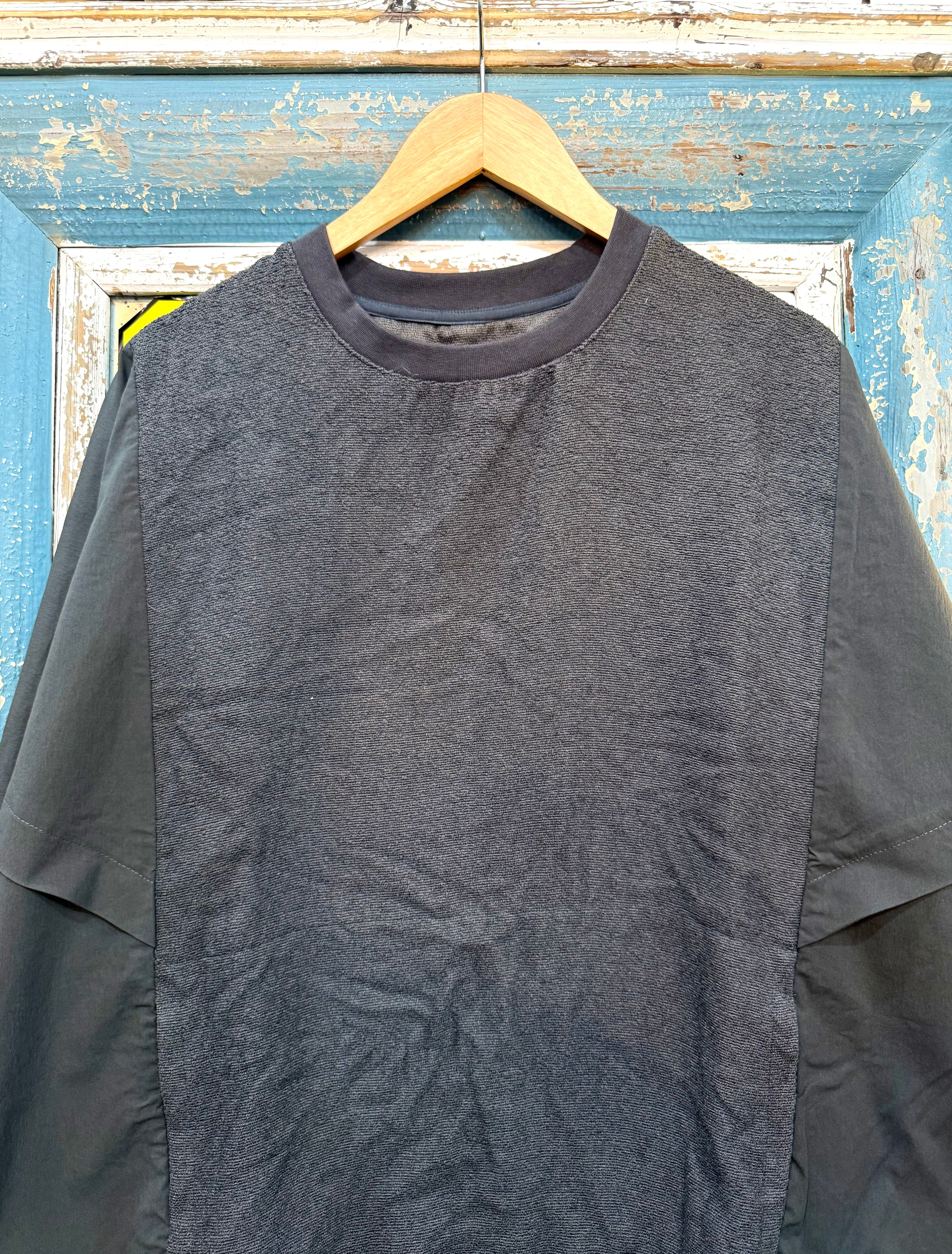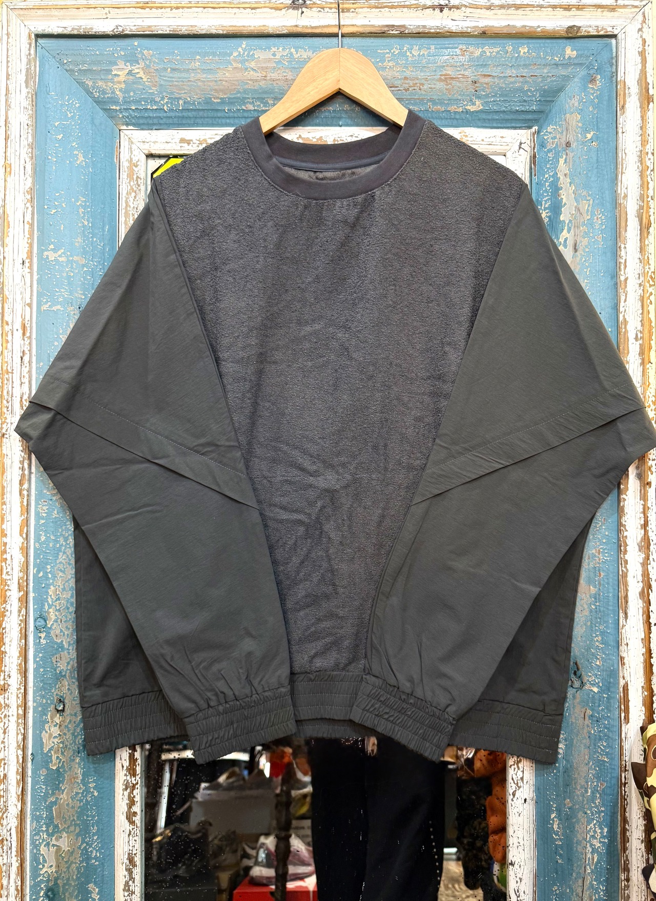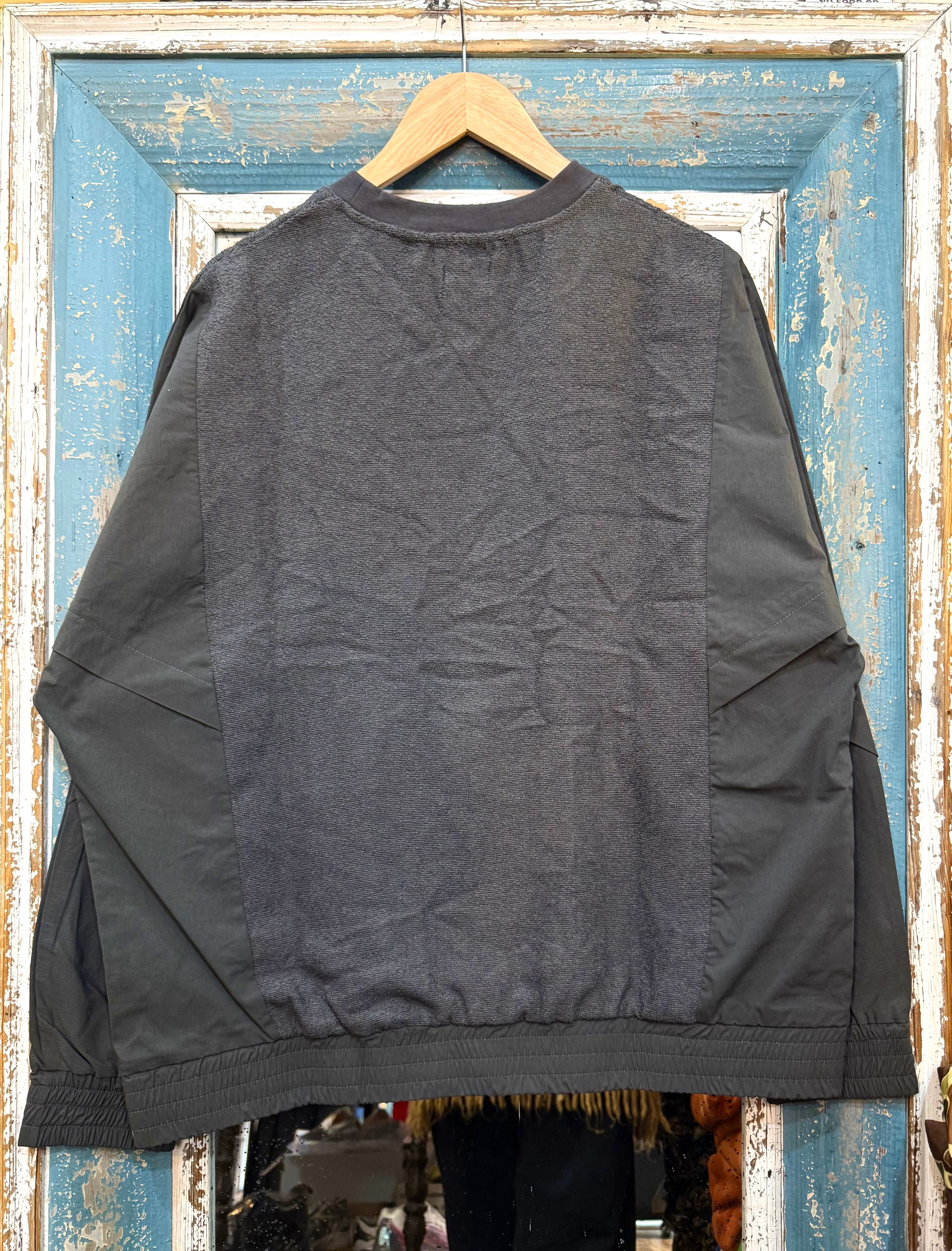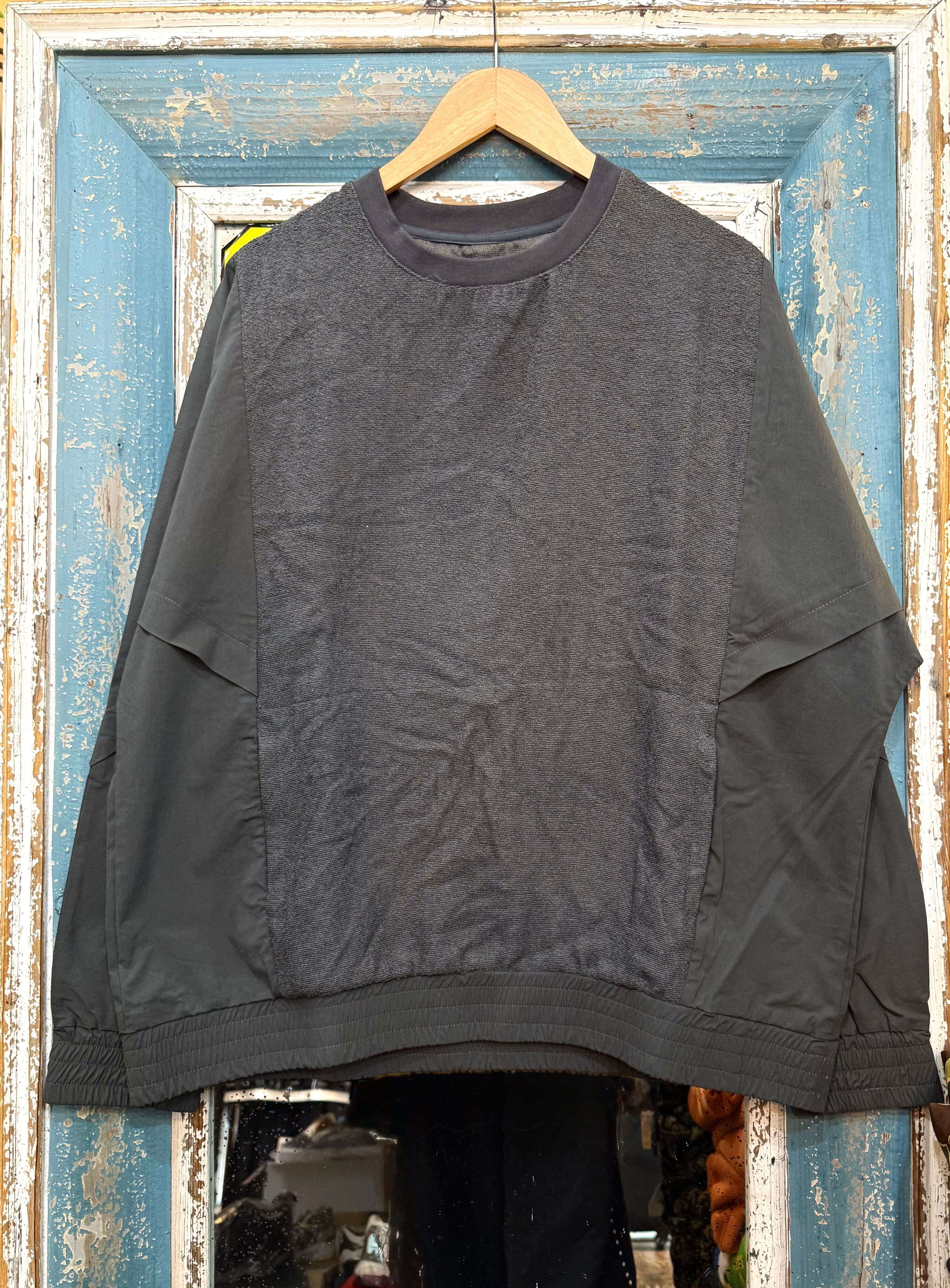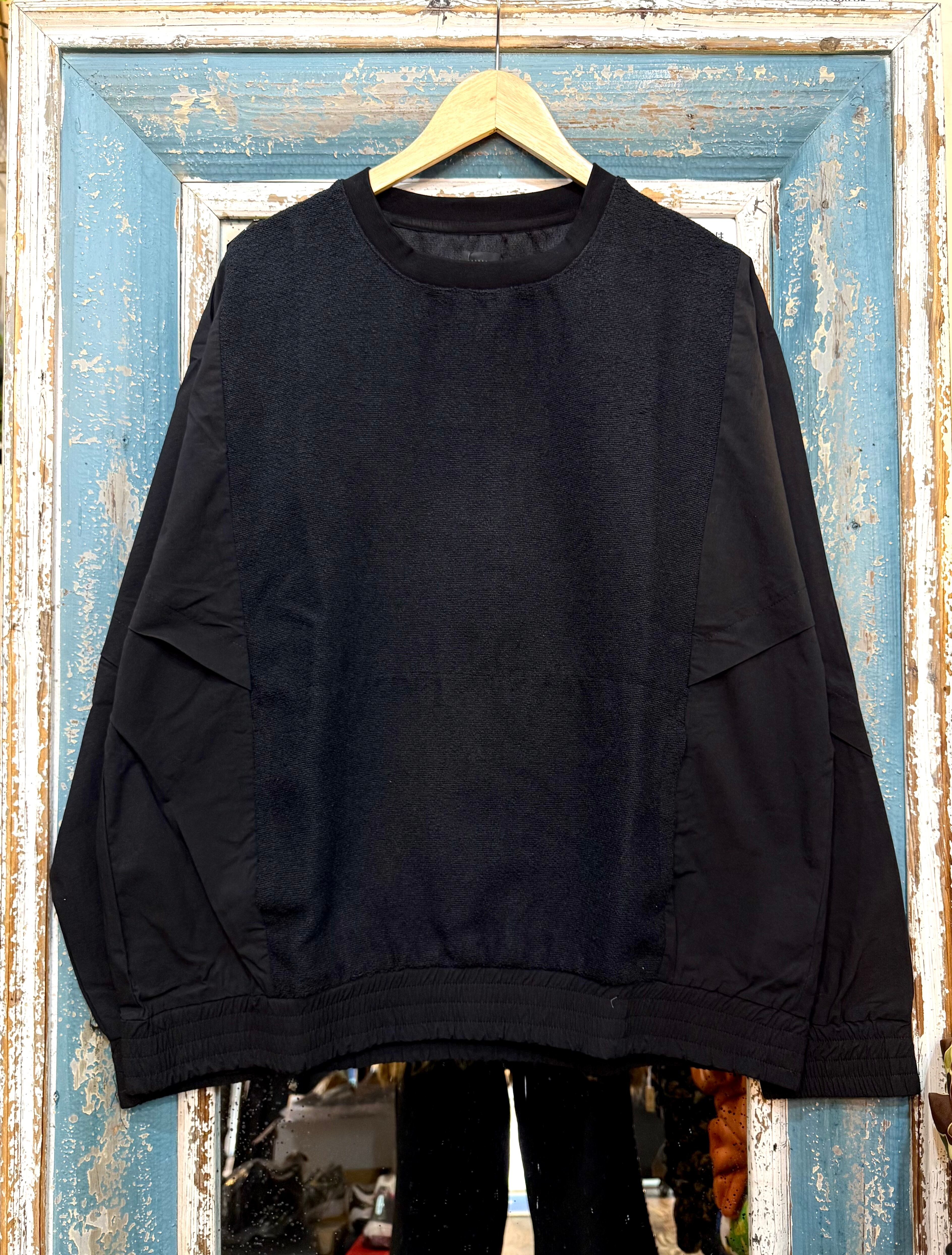 スウェットのようなカジュアルさと、布帛ライクなきれいめ要素を併せ持った一枚。タウンユースにもリラックスウェアにも活躍する、抜け感のあるデザインです。