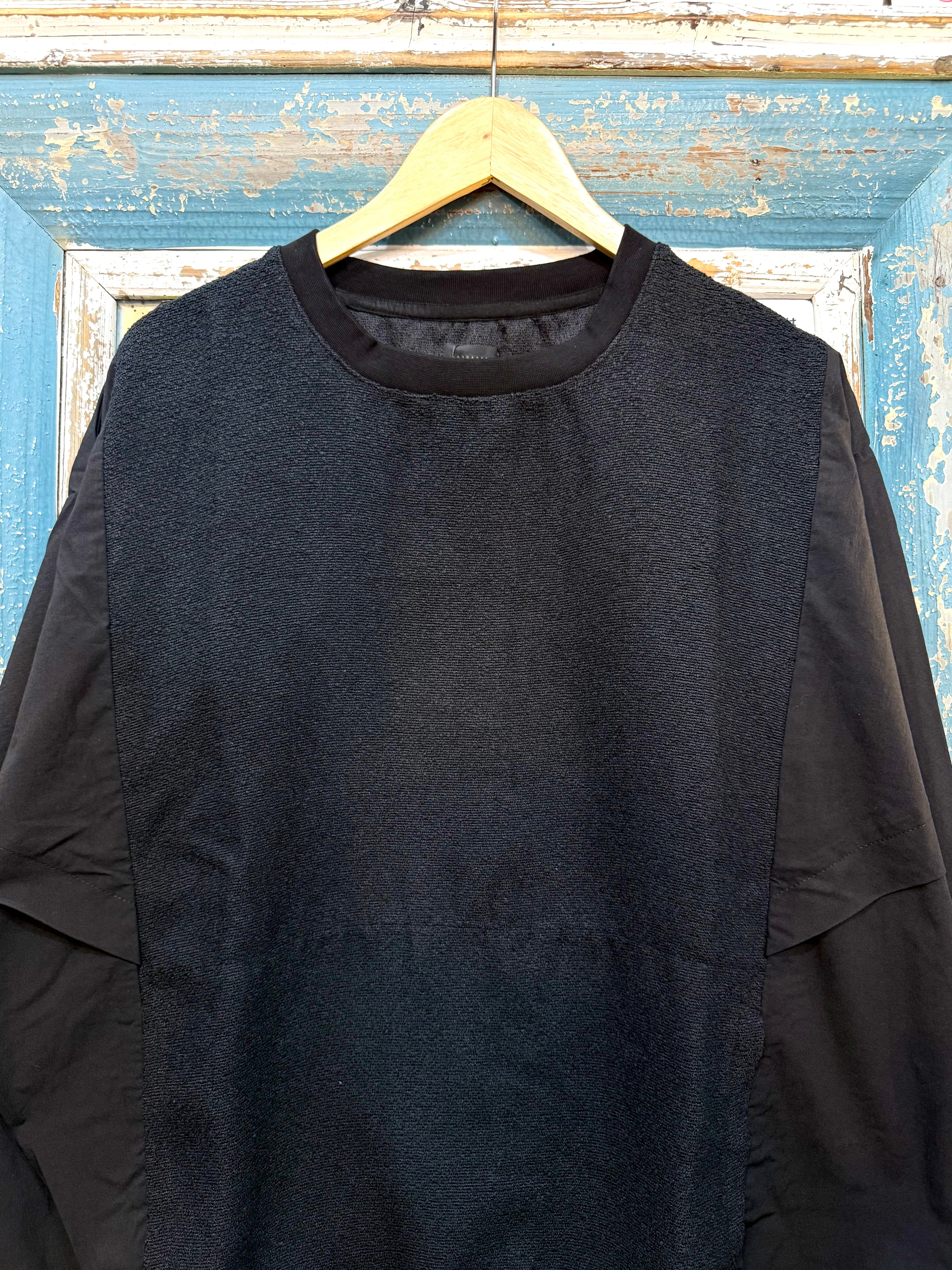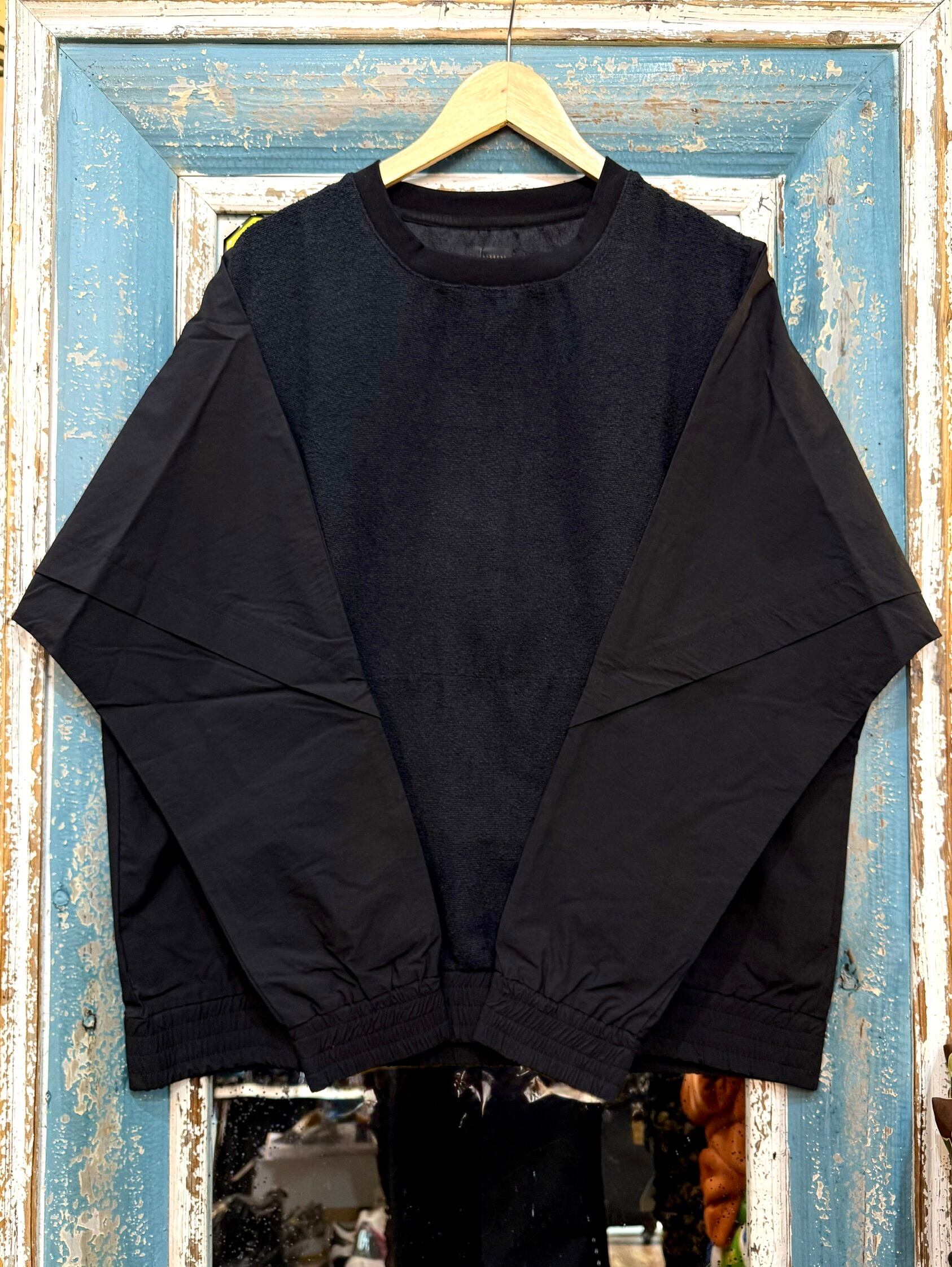 異素材コンビが印象的なドルマンスリーブクルーネック。ゆったりとした身幅と特徴的なドルマンスリーブが生み出す独特のリラックスシルエットが魅力。フロントのブークレ素材が上品な立体感とあたたかみを演出し、袖・サイドのナイロン素材が軽さとシャープな印象をプラスします。