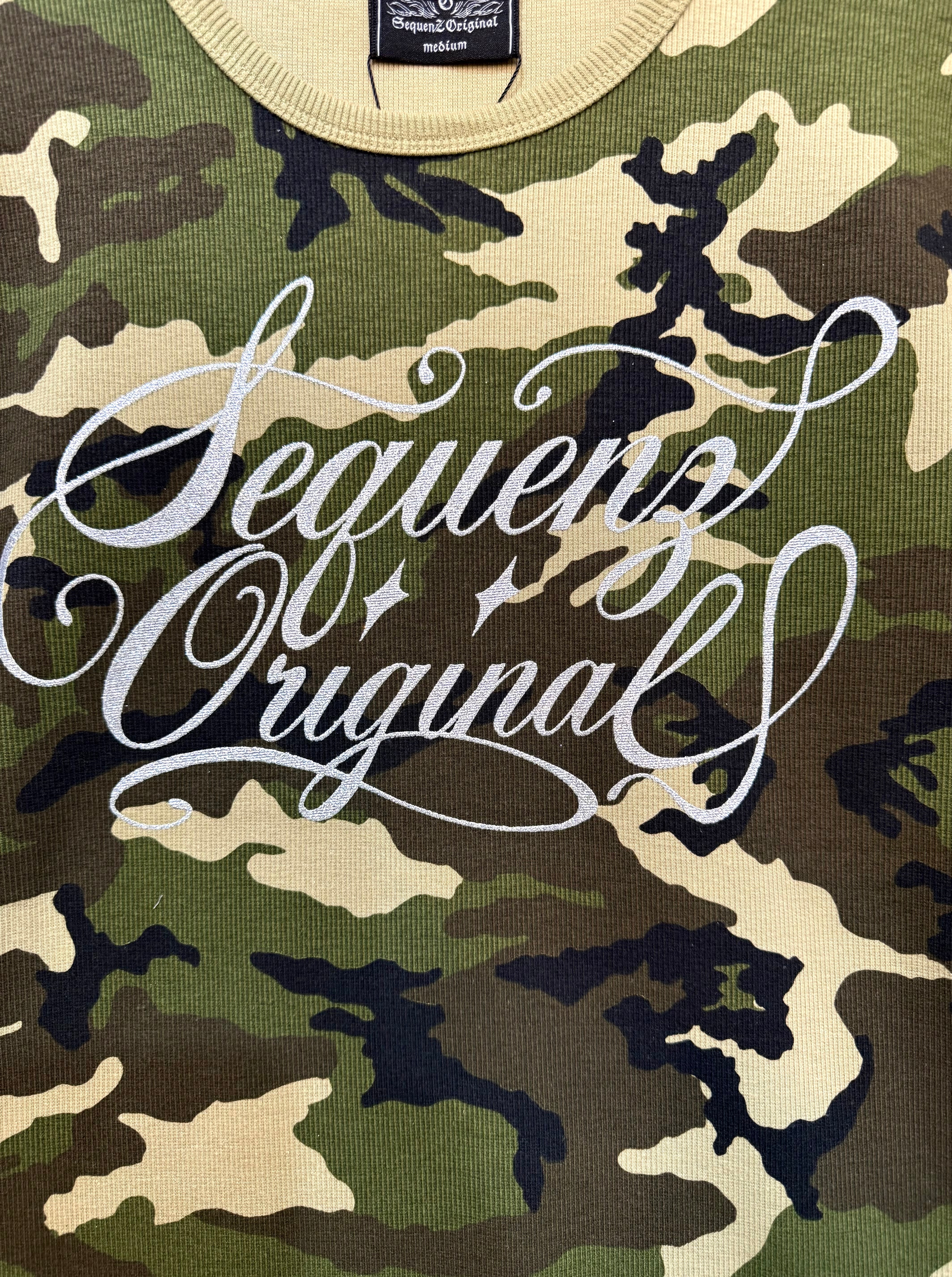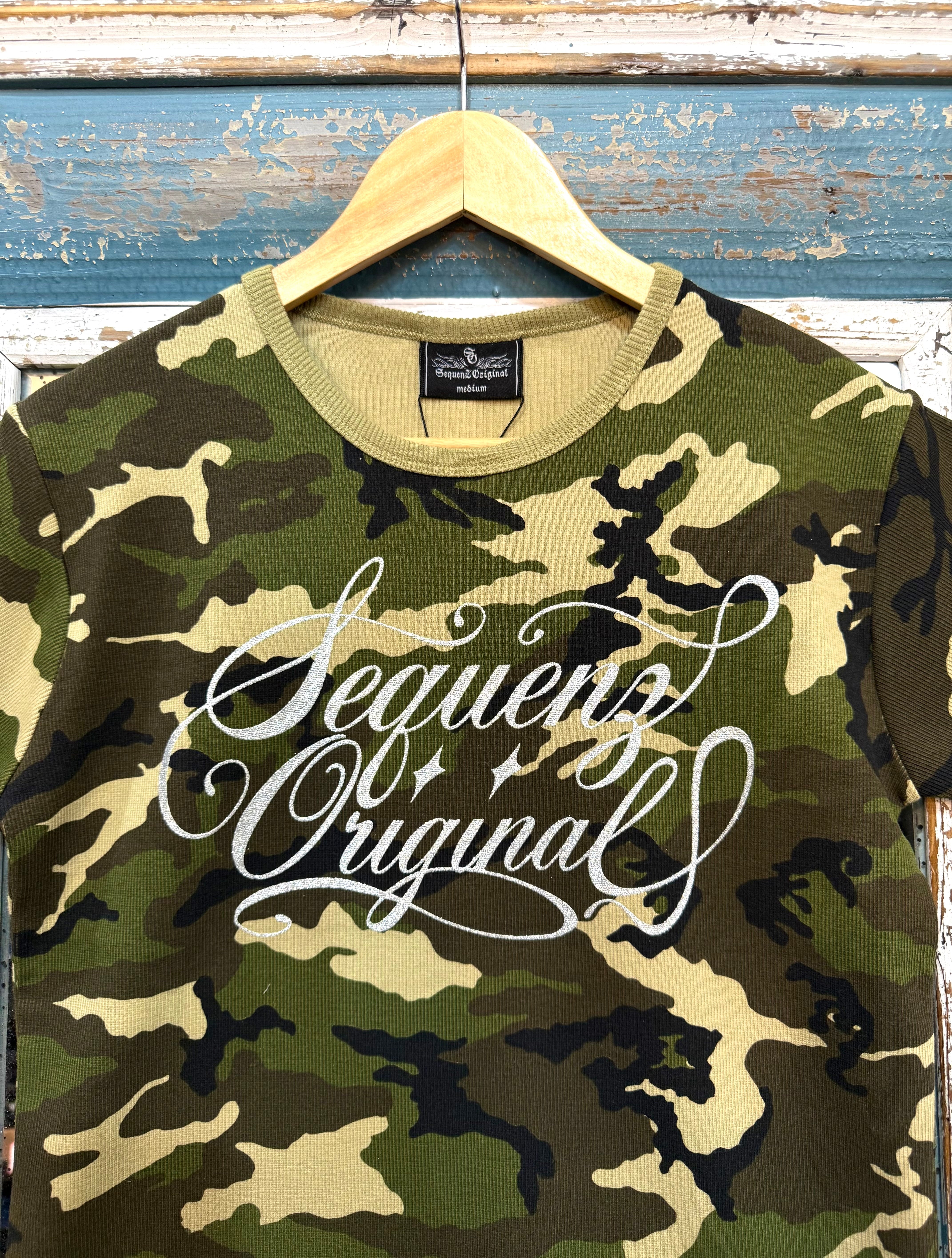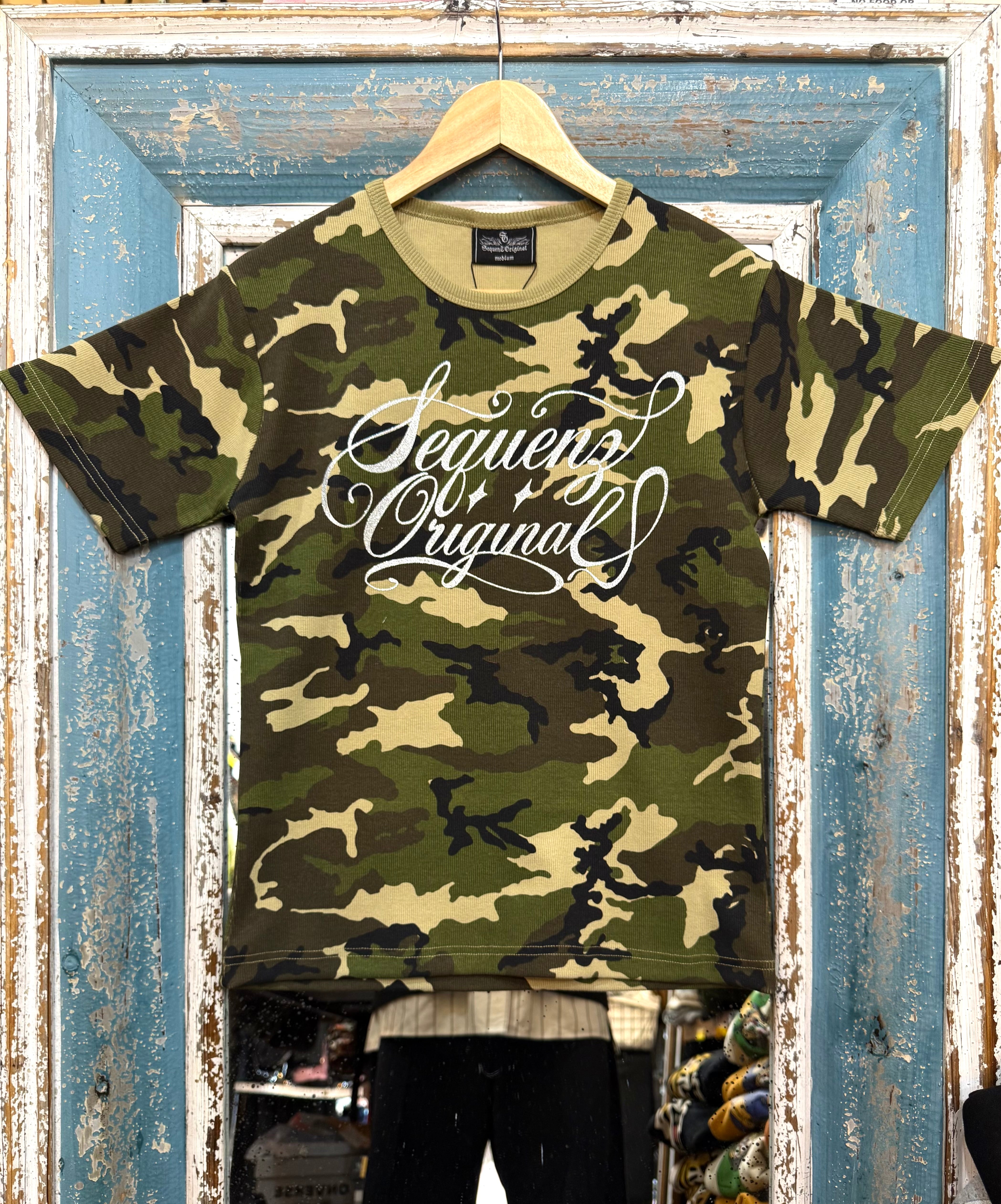 Y2KスタイルにぴったりなフィットタイプのテレコTシャツが新登場!迷彩柄にキラキラ輝くシルバープリントのロゴが施されたこのアイテムは、カジュアルからストリートスタイルまで幅広く活躍します。友達とのお出かけやフェスティバル、日常使いにもおすすめの一品です。個性的なデザインがあなたの魅力を引き立てます!