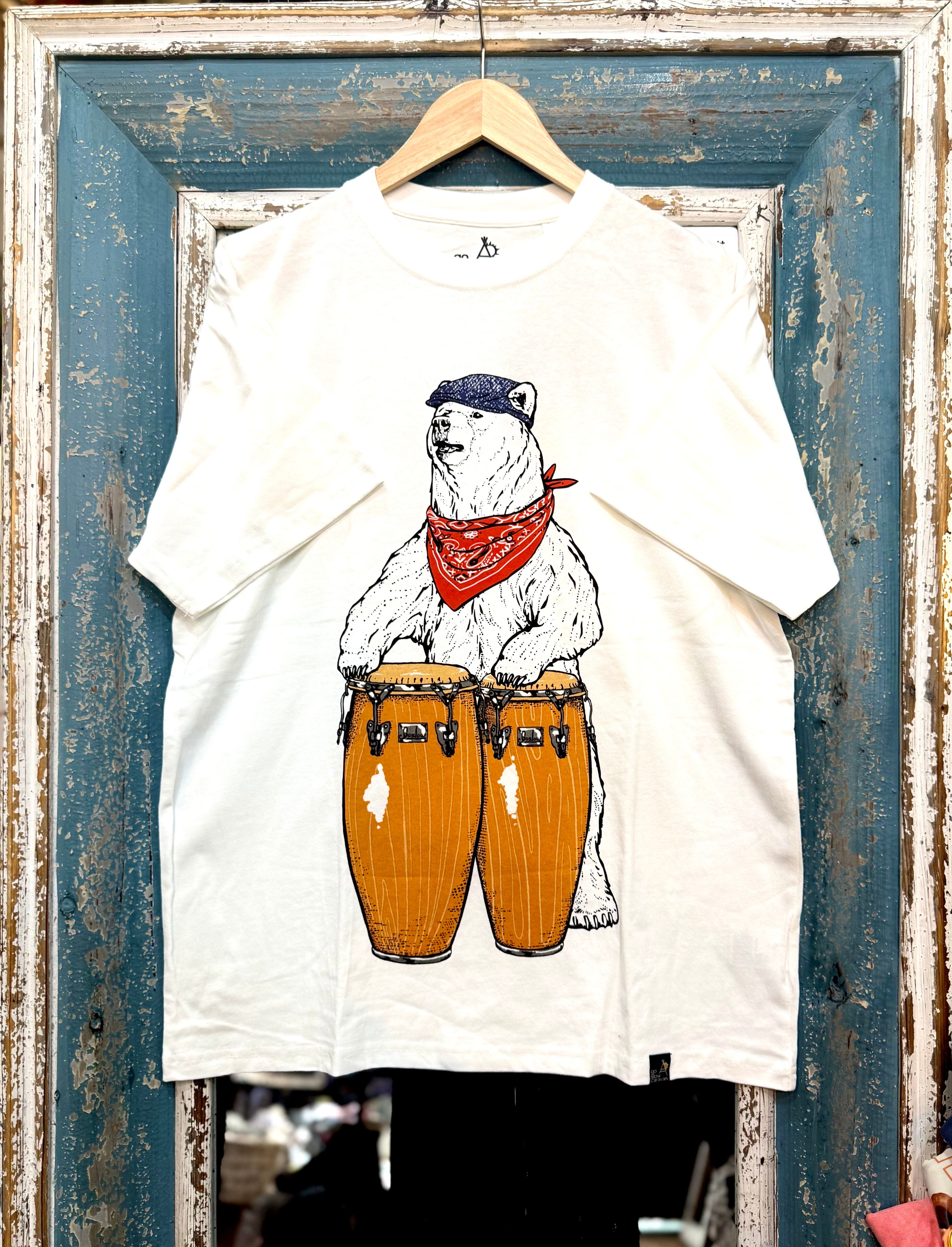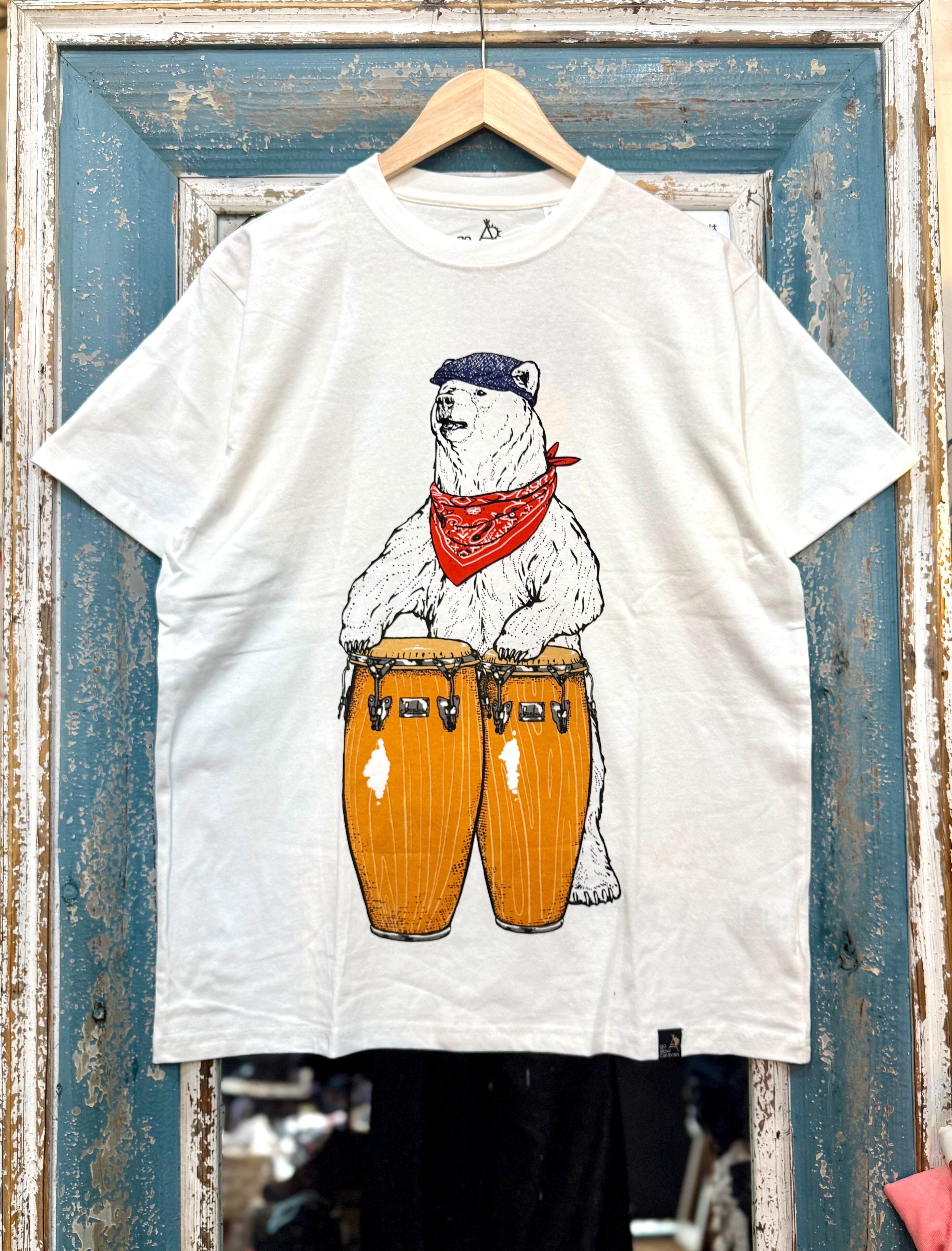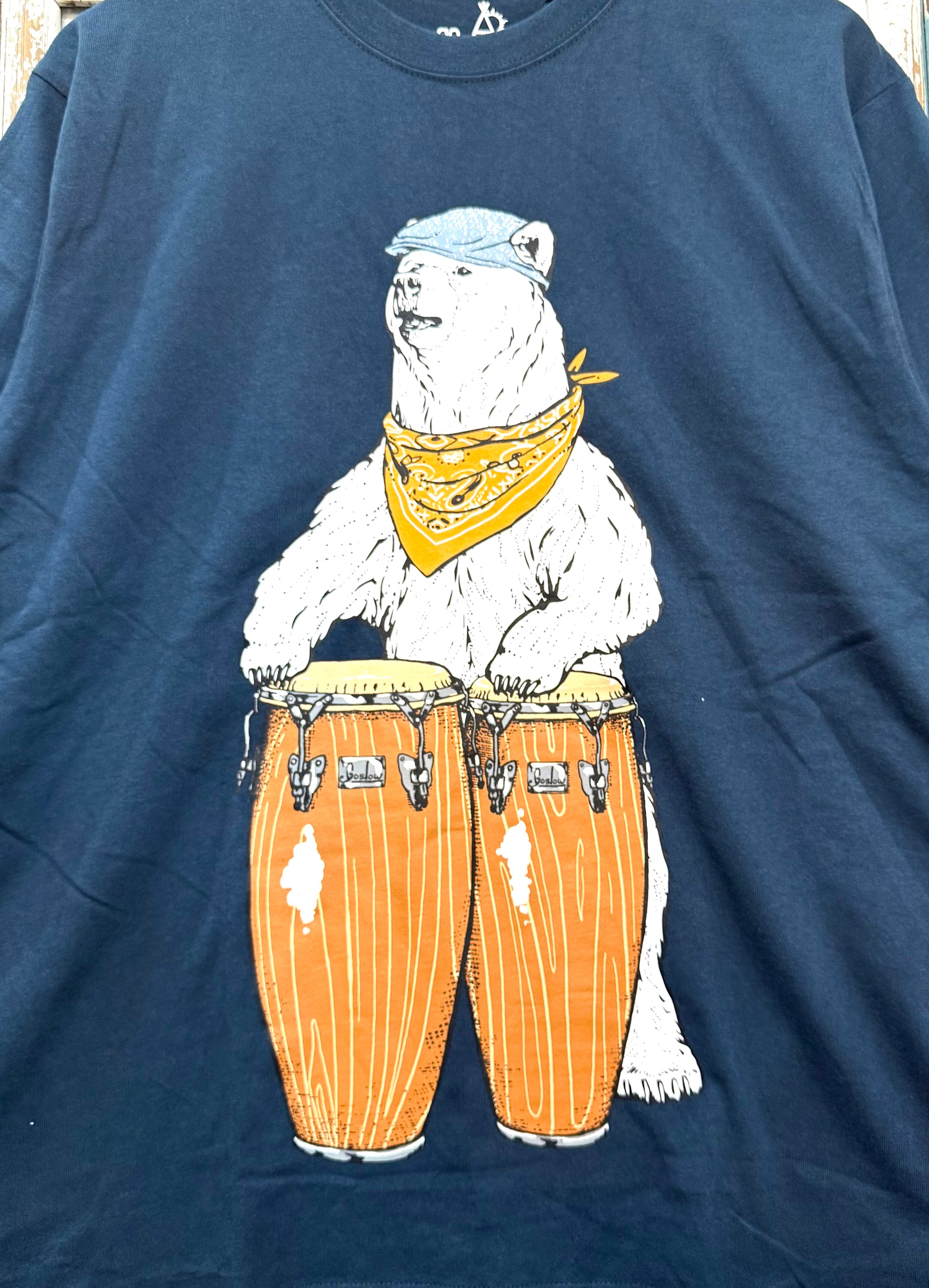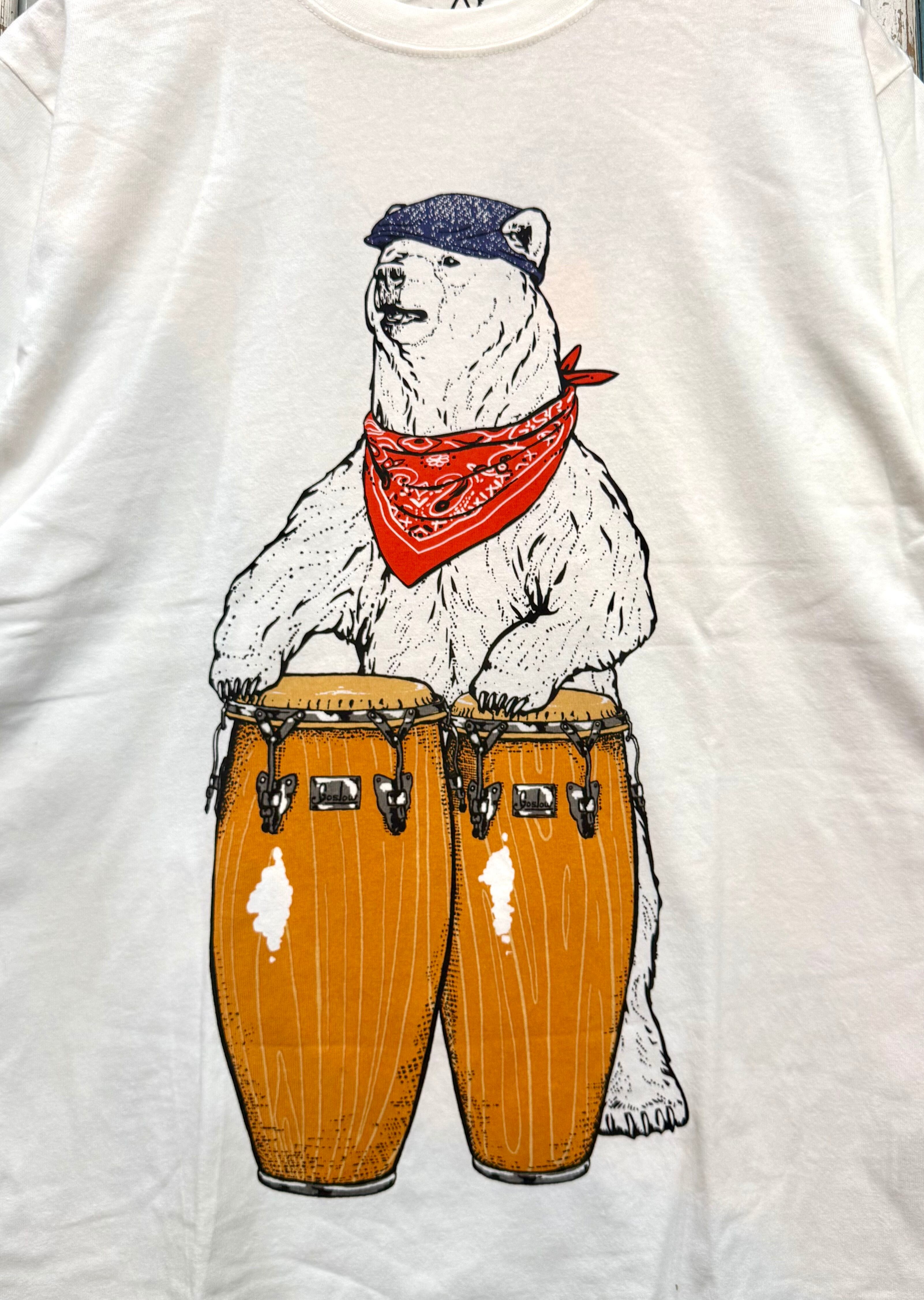 ● キュートなコンゴを叩く熊がフロントにプリントされ、見る人を楽しませる一枚