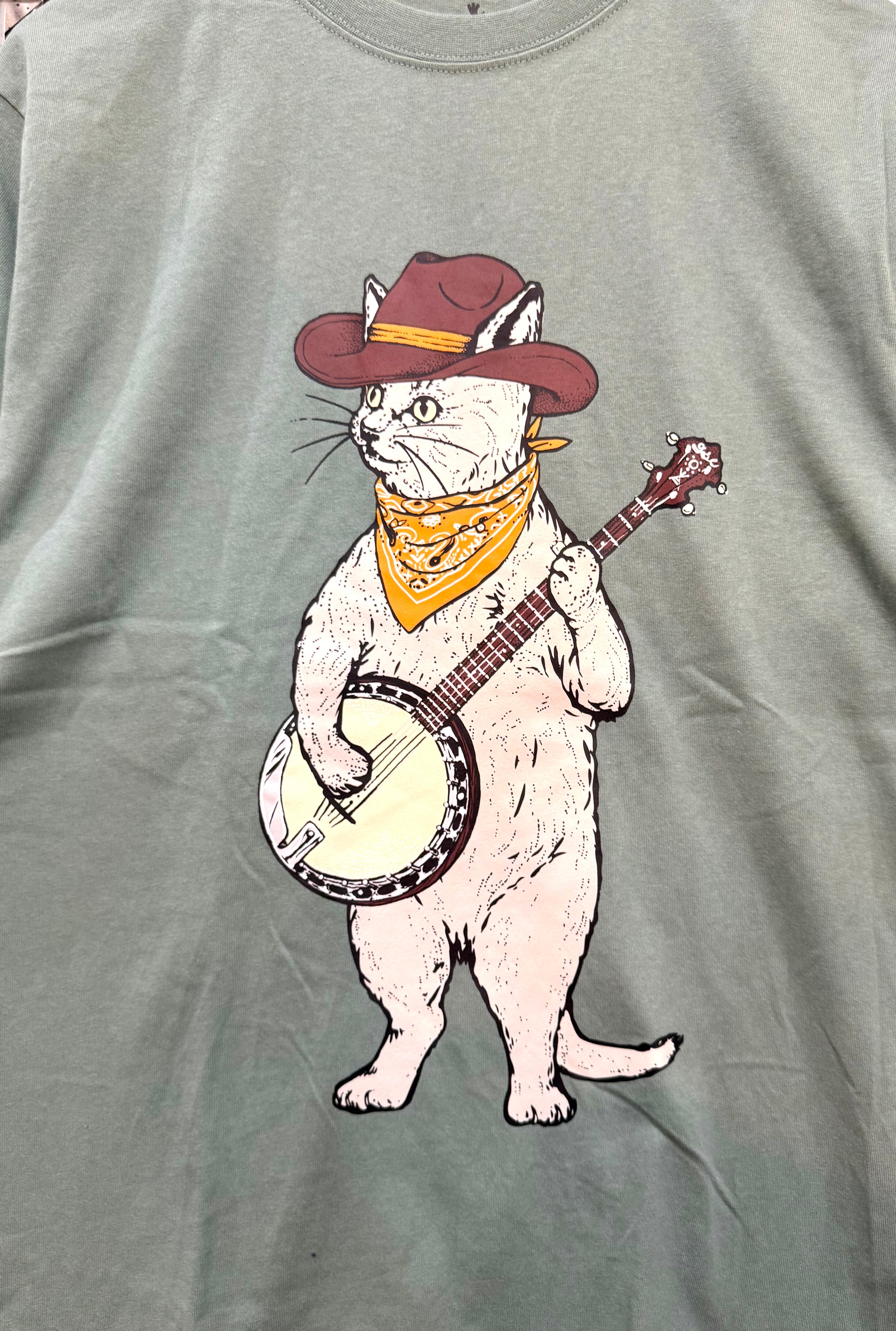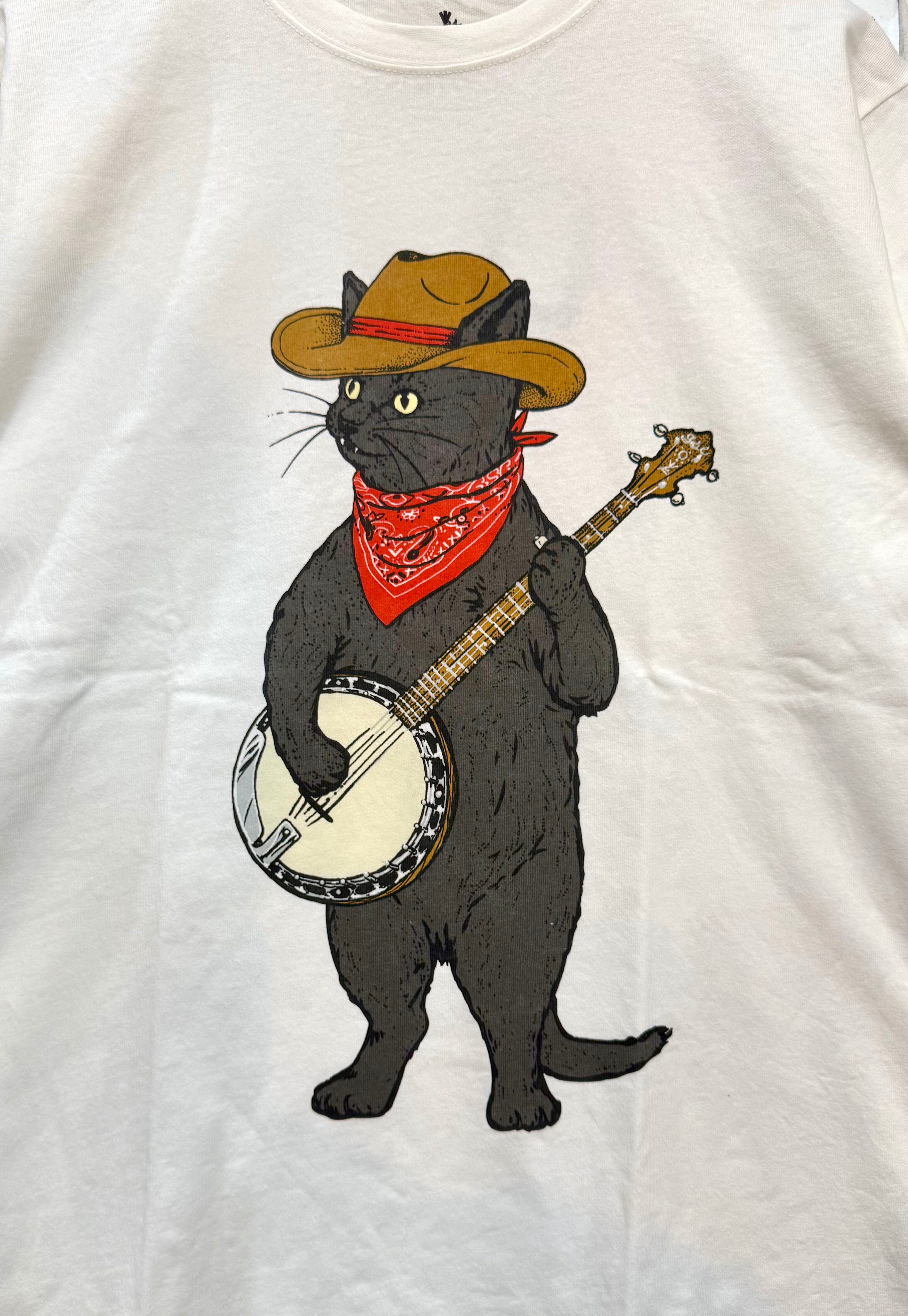 ● バンジョーを弾く猫がフロントにプリントされた、愛らしさ満点のTシャツ