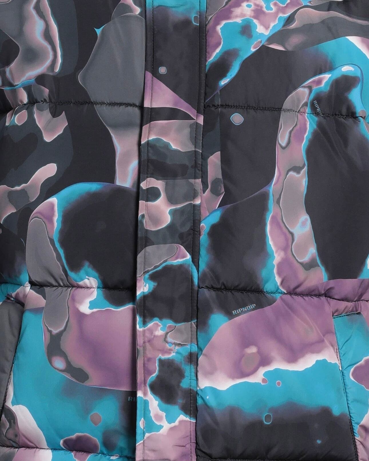アメリカより仕入れた、RIPNDIPリップンディップの中綿ジャケット。パープルのアブストラクト柄がとても鮮やかで、おしゃれなアウターです。寒い季節にぴったりの中綿入りで、暖かさも抜群です。デザインもシンプルながら個性的で、どんなスタイルにもマッチします。キラキラ輝くパープルの柄が、あなたを一際輝かせます。冬のコーディネートにはもちろん、春や秋のアウターとしても活躍します。ファッションのアクセントとして、ぜひお手持ちのアイテムに加えてみてください。