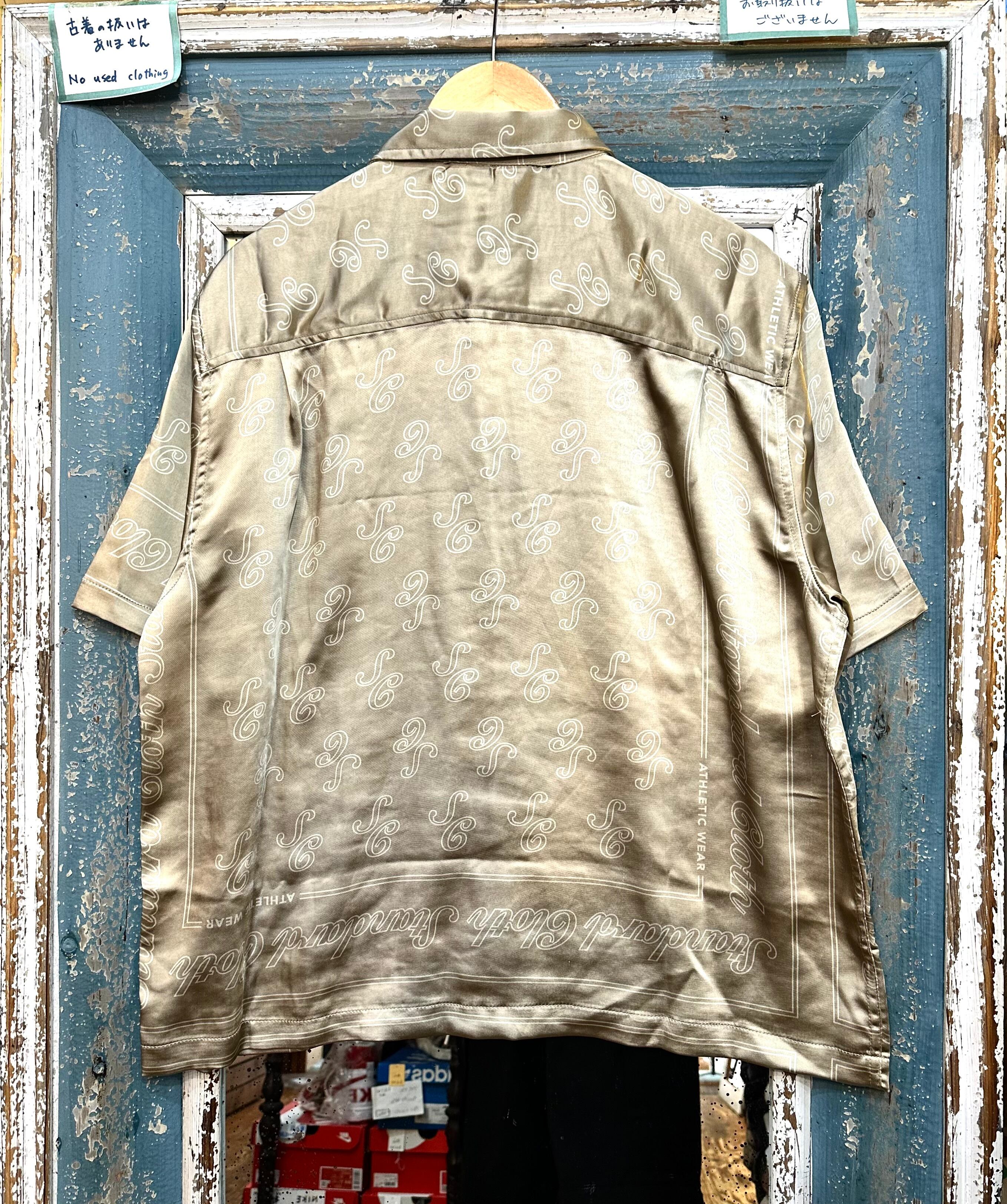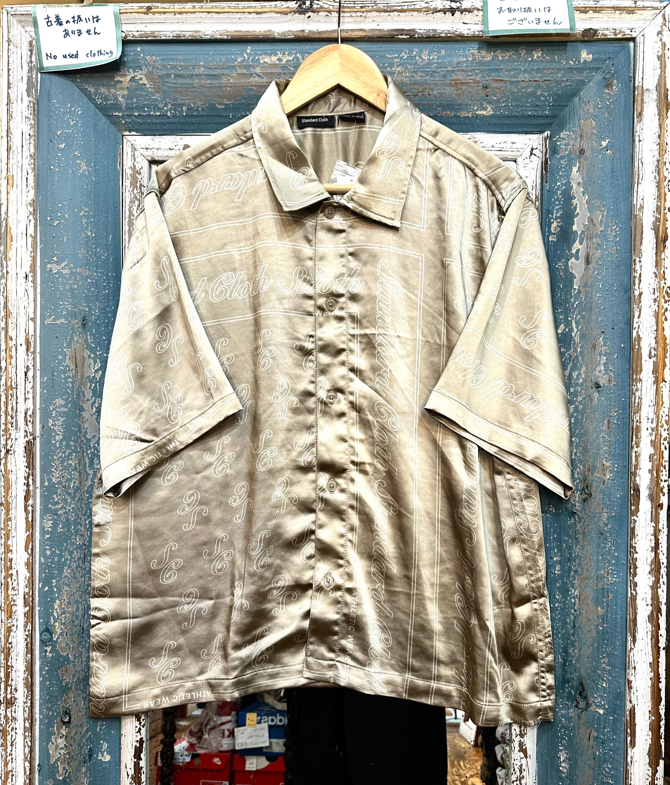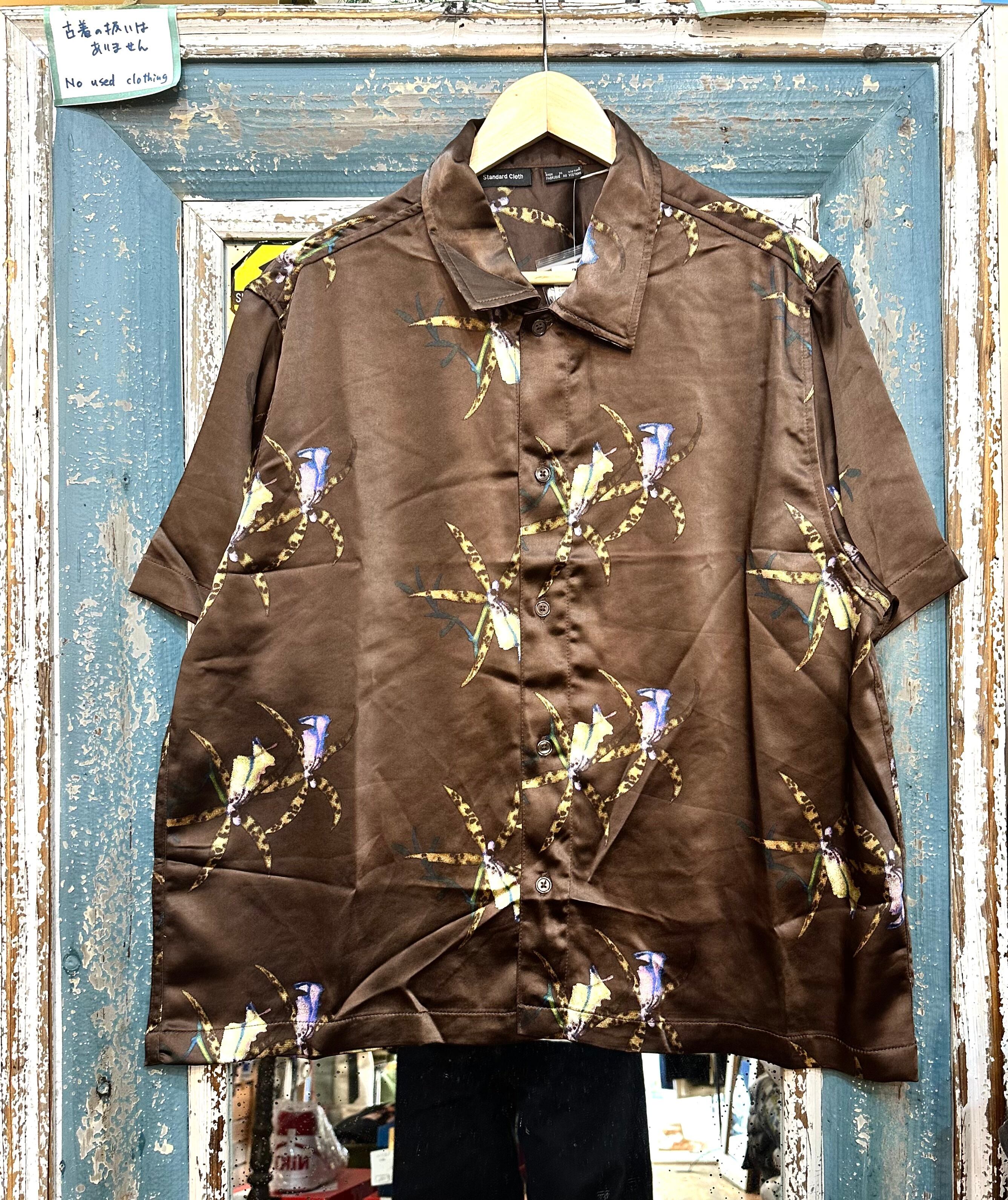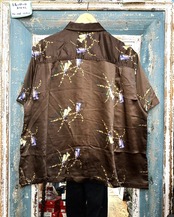 光沢のあるサテン地に柄の入った半袖シャツです。