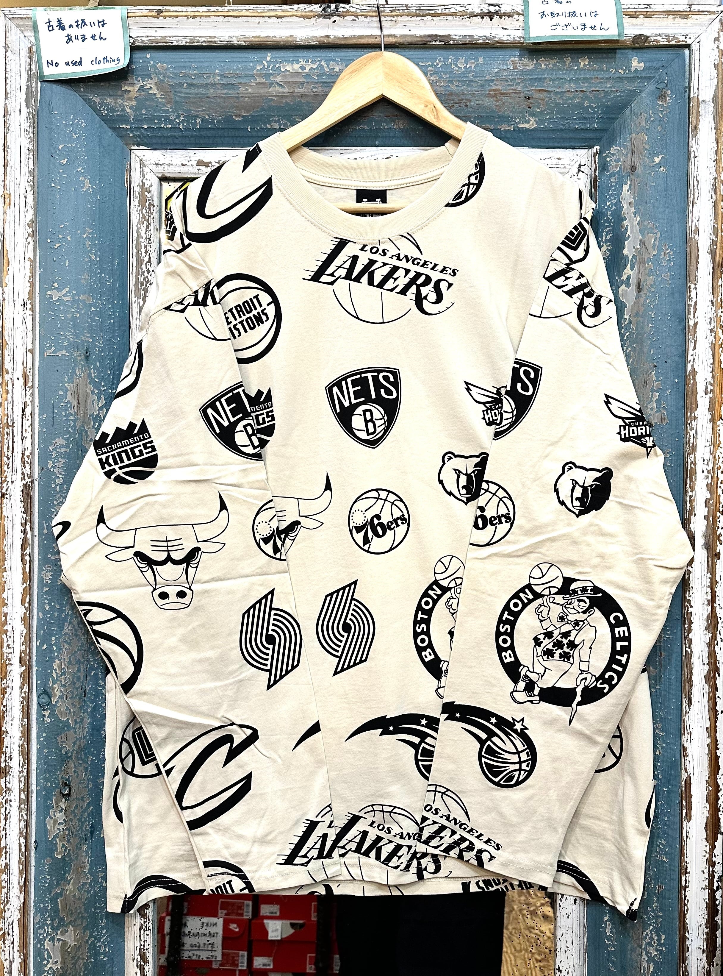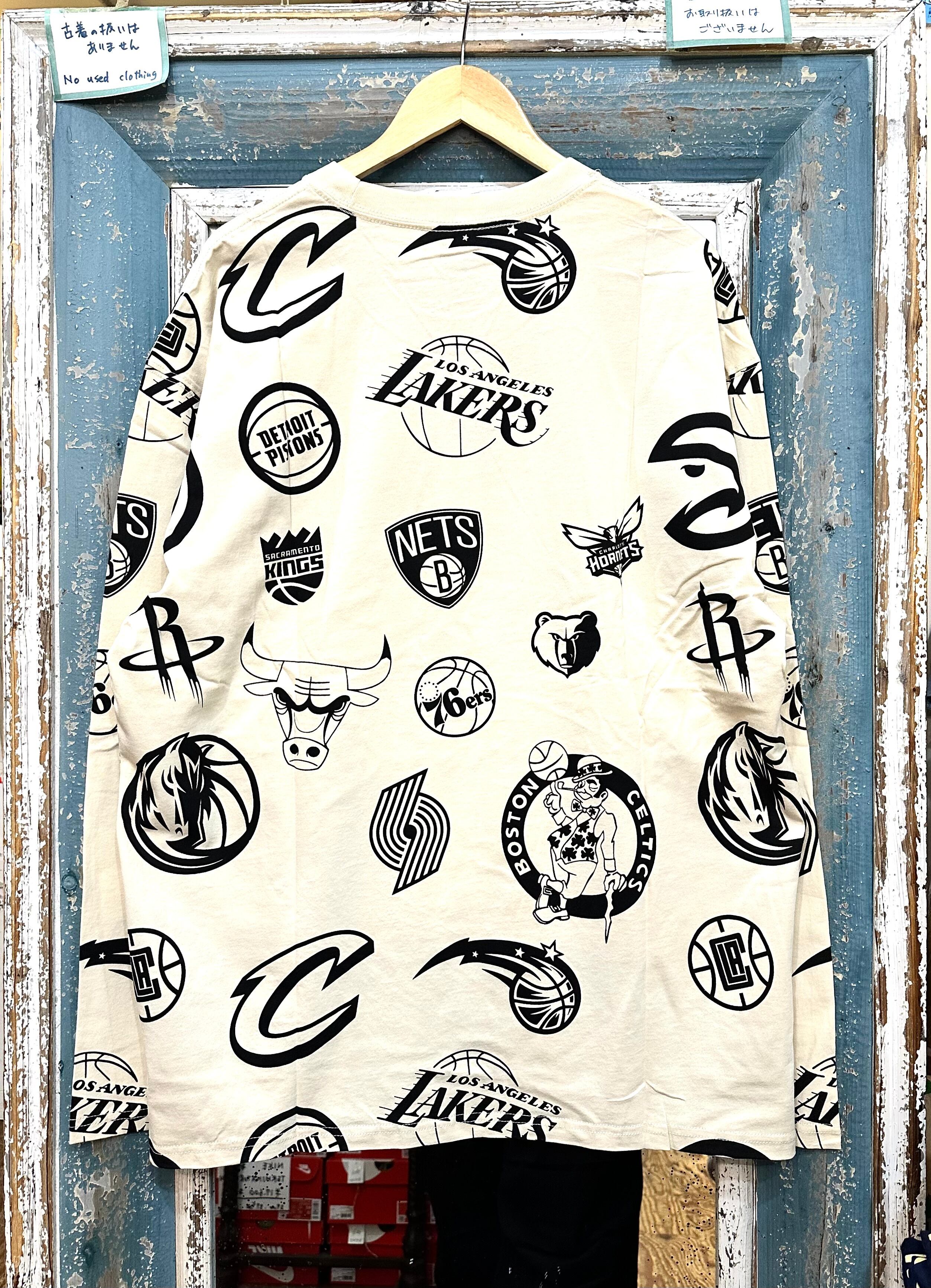 バスケットボールNBAチームの色んなロゴが総柄になったロンTです。