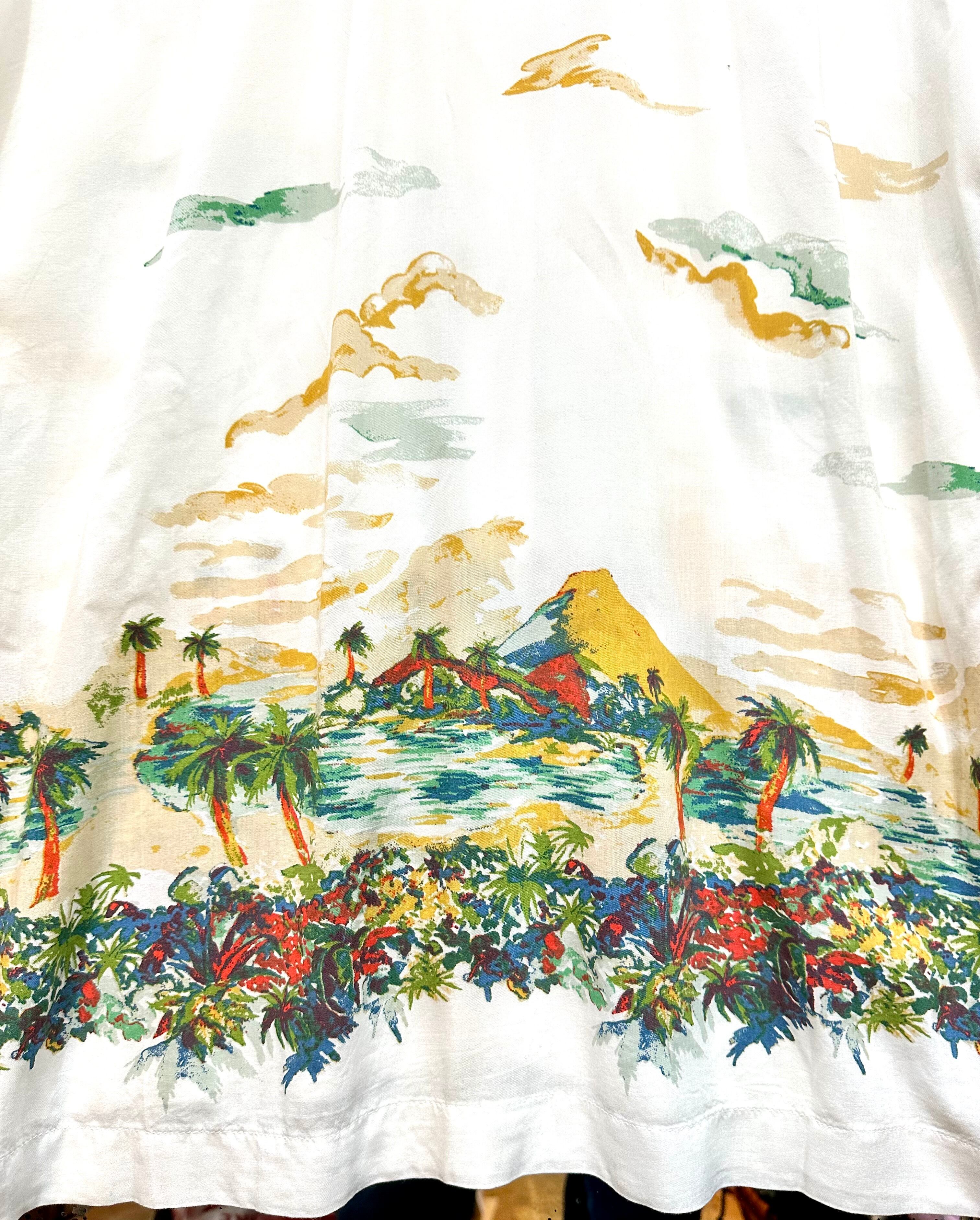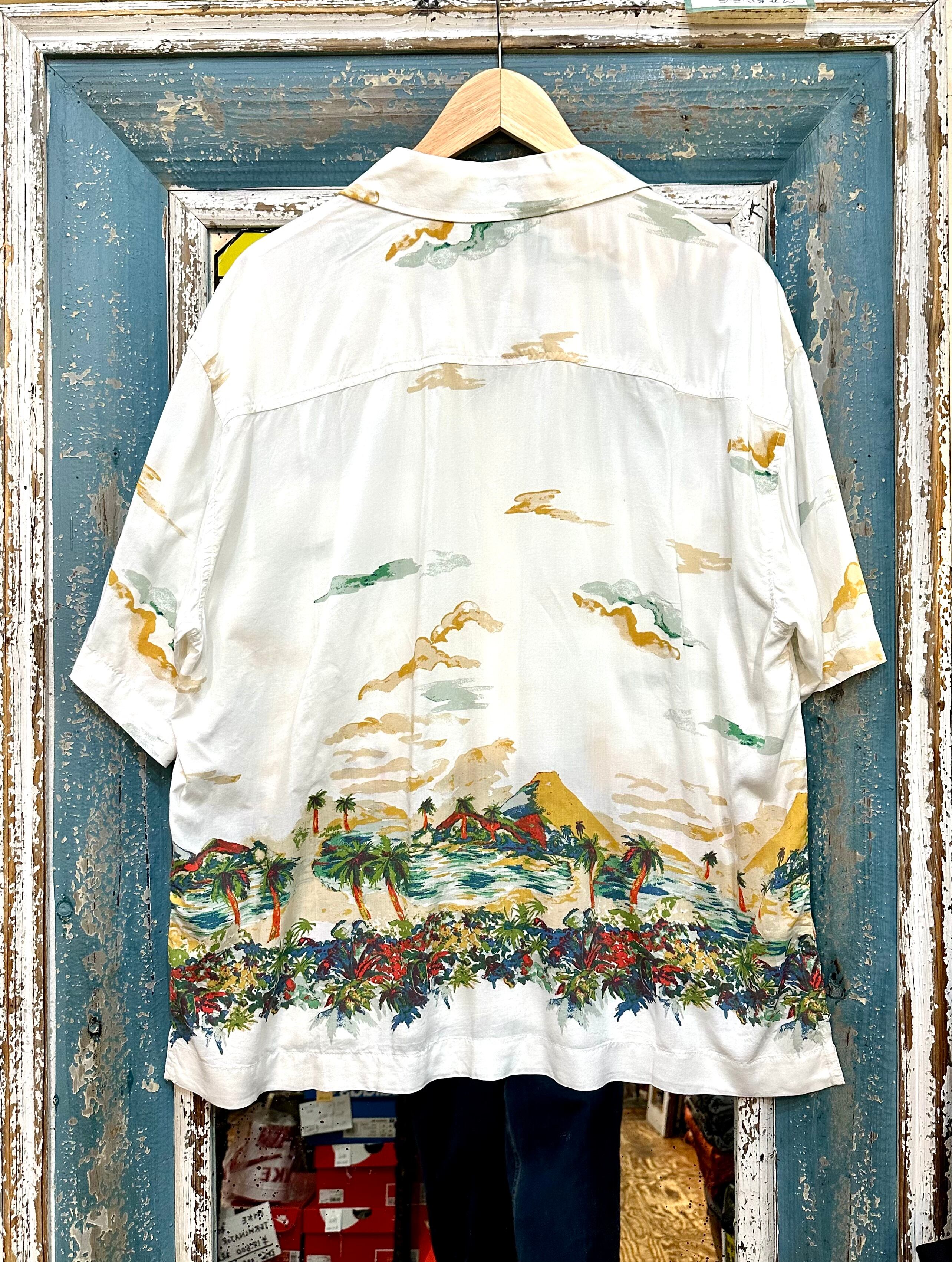 リゾート地がプリントされた涼しげなオープンカラーのシャツです。