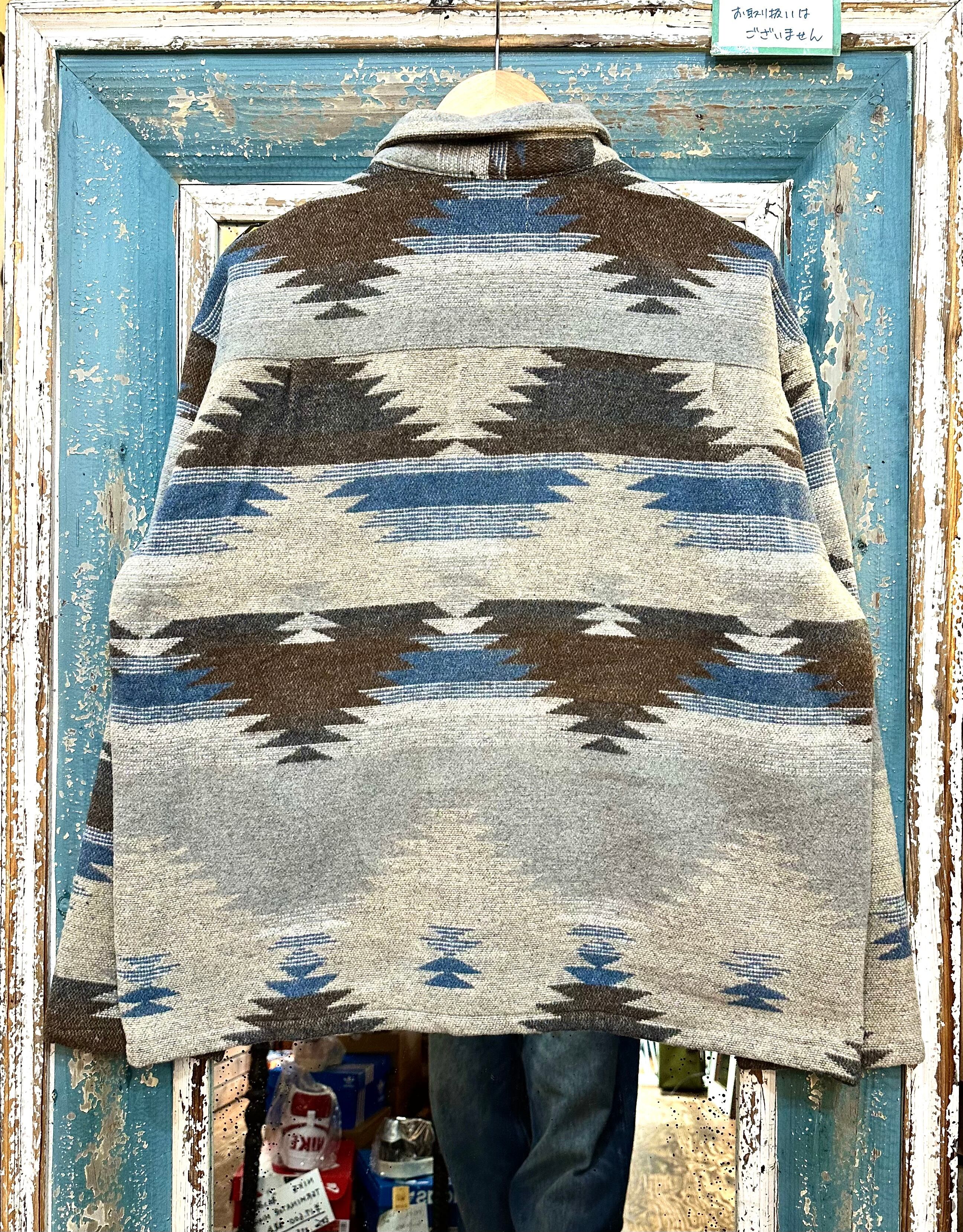 インパクトのあるオルテガ柄が目を引き、前身ごろのポケットもポイントのシャツジャケット。