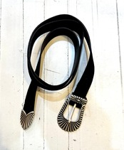 スエードタッチウエスタンベルトのです。特徴的なバックルがアクセントになり、シンプルなコーディネートに個性をプラスしてくれます。さらに、柔らかなスエードタッチの素材を使用しているので、肌触りも抜群です。