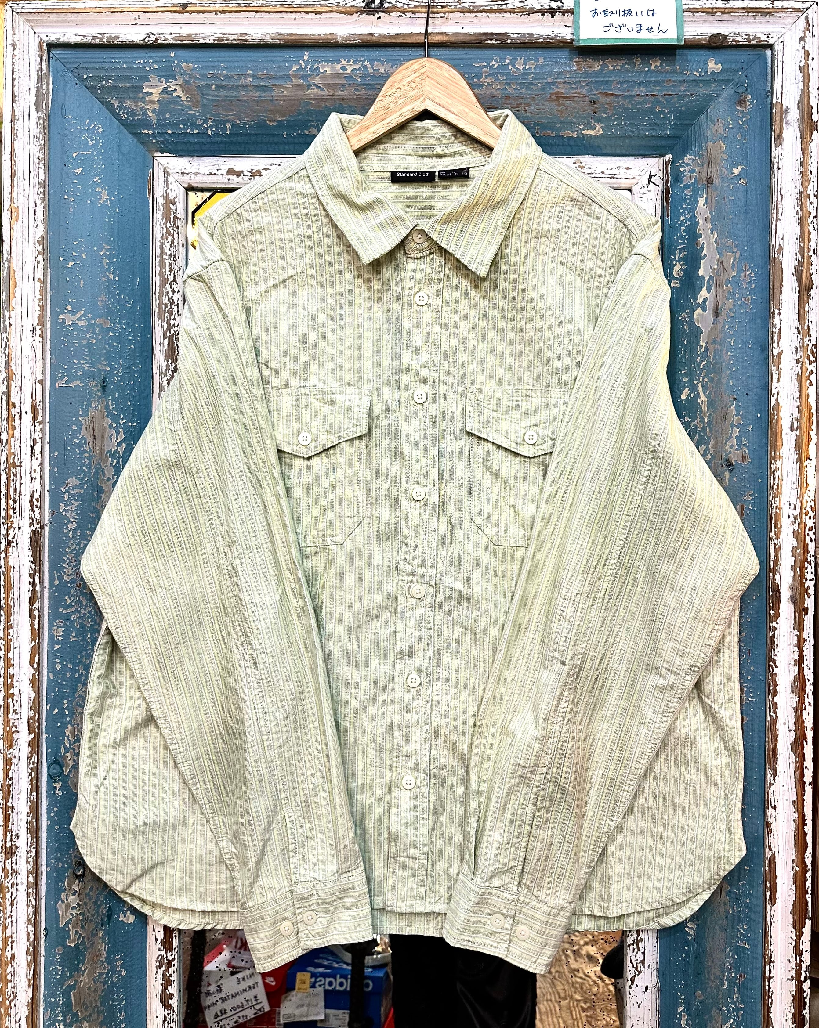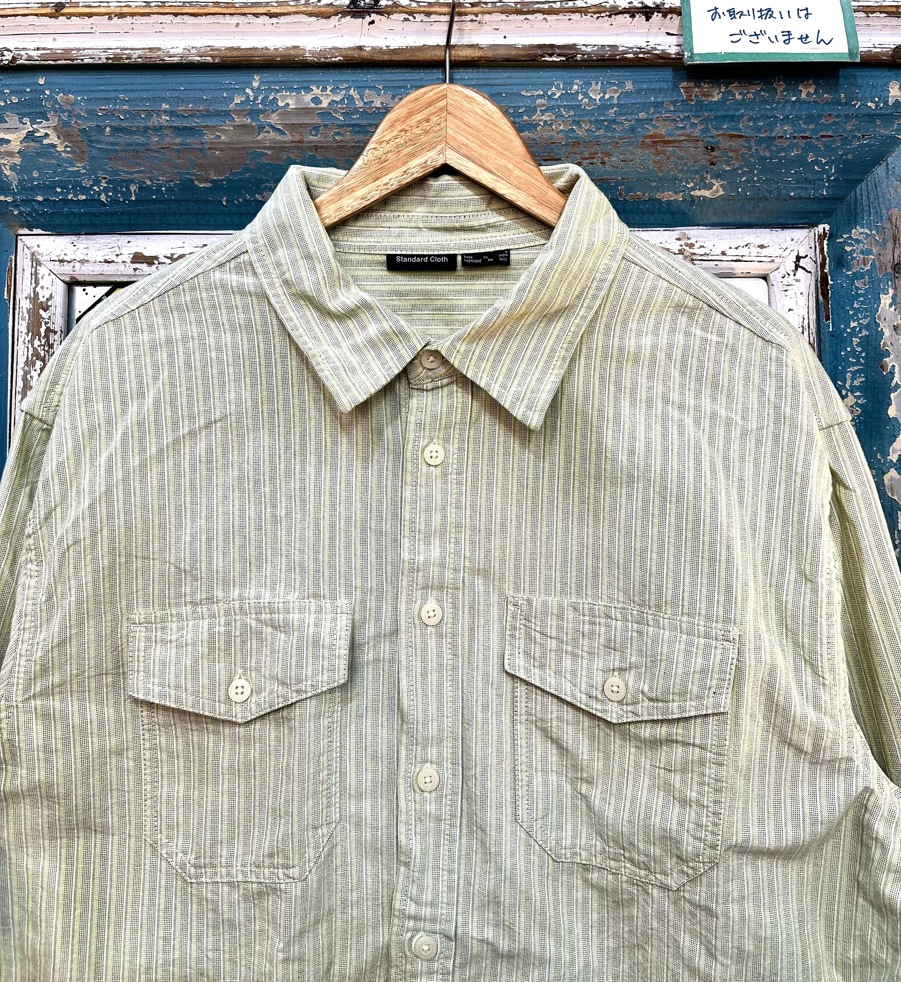 Standard Clothのストライプウォッシュシャツは、アメリカから買い付けた上質なコットン素材を使用しています。ウォッシュ加工が施されたこのシャツは、柔らかく肌触りの良い素材で、着心地も抜群です。また、グリーン系の織りのストライプ柄が、これからの季節にぴったりの爽やかさを演出してくれます。