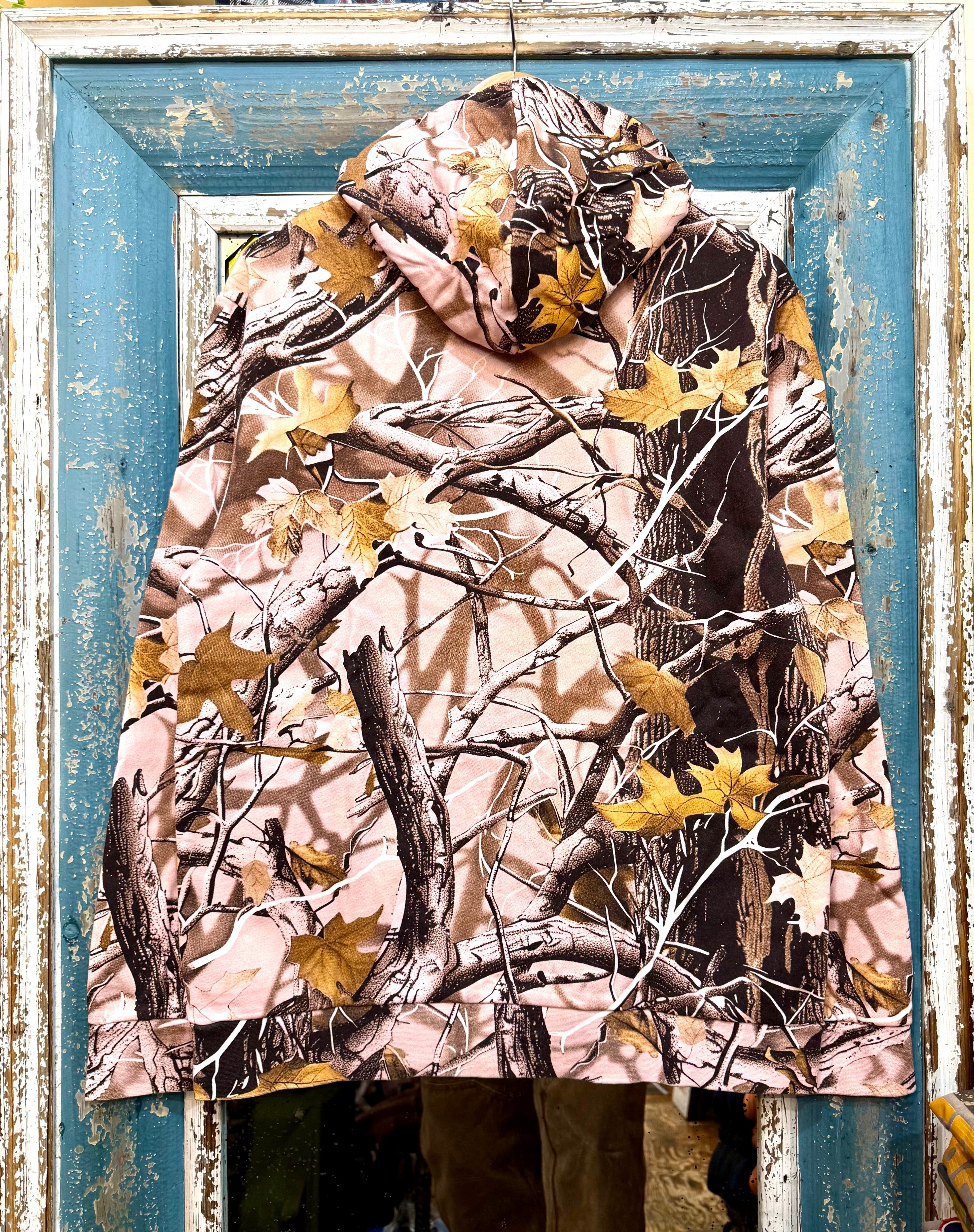アメリカより買付た、knitswellのリアルツリー柄のフーディが新登場です!このフーディは、ピンクのリアルツリー柄が特徴で、これからの季節にぴったりなアイテムです。カジュアルスタイルに映えるデザインで、日常使いにも最適です。