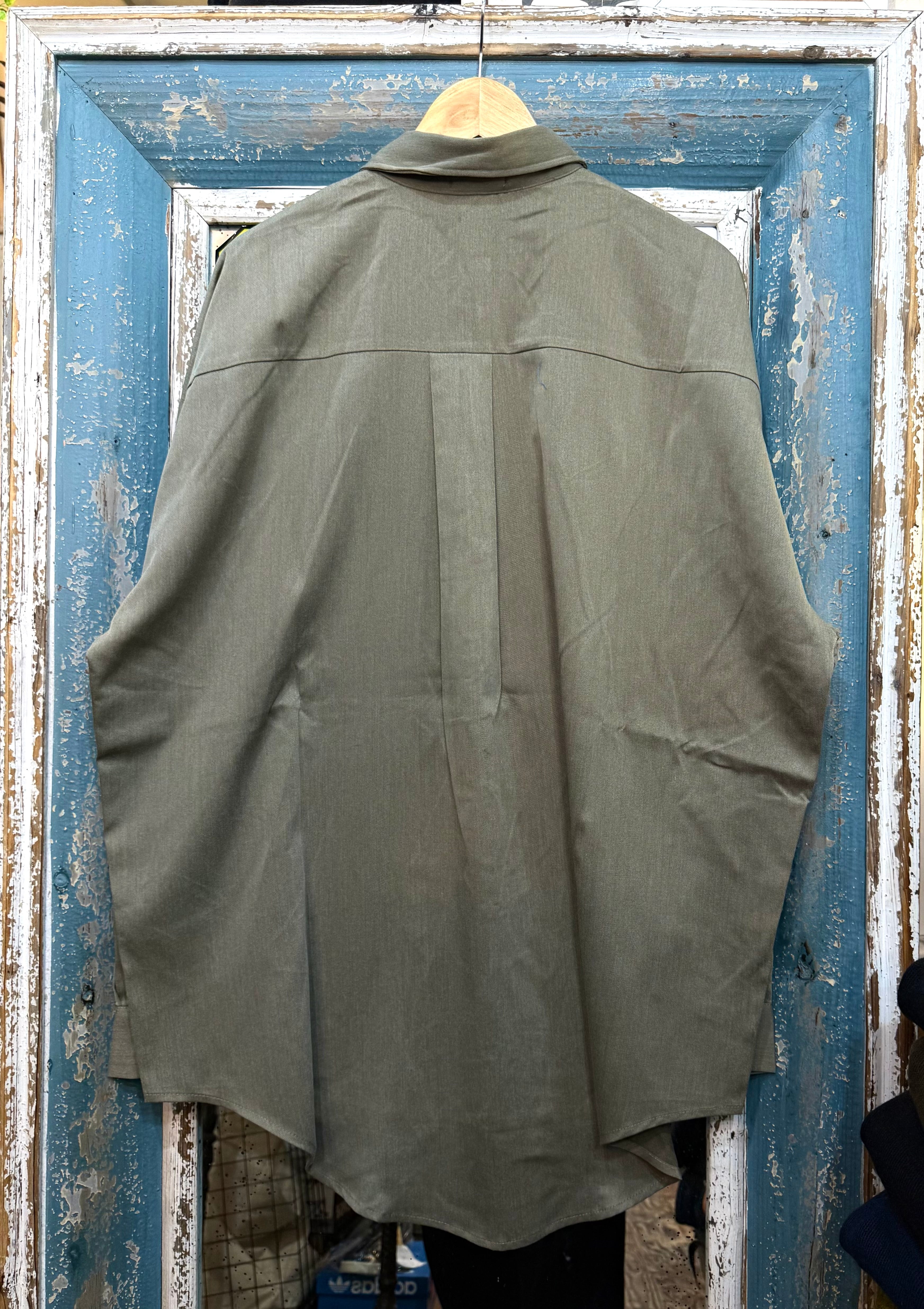 《デザイン》ドロップショルダーとワイドなシルエットがアクセントになったリラックスシルエットのレギュラーカラーシャツ。着丈に前後差をつけよりドレープな印象に。ドレープ感のある素材に、着回しを考慮したシンプルなデザインで、気品の漂う、抜け感のあるスタイリングを演出します。
